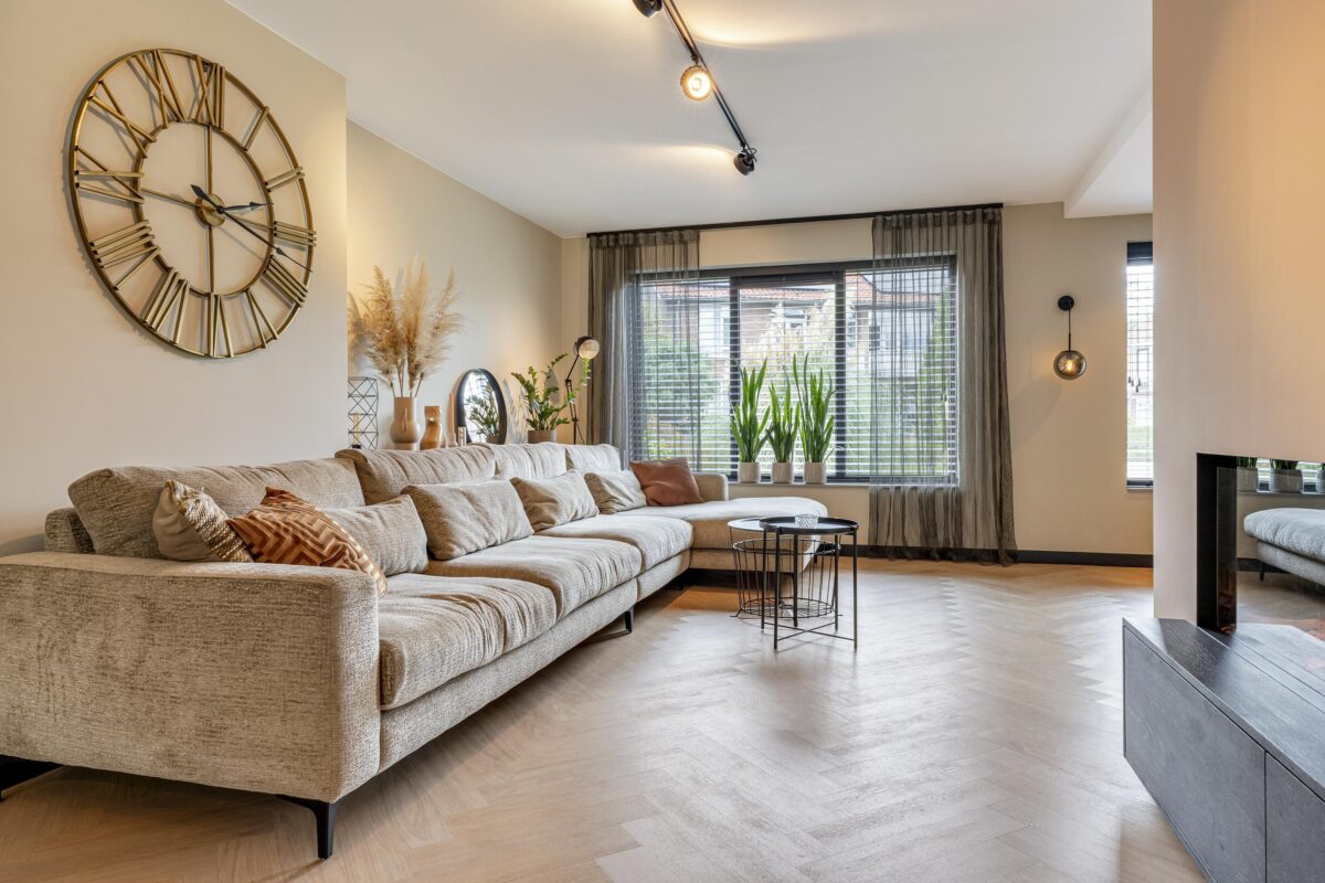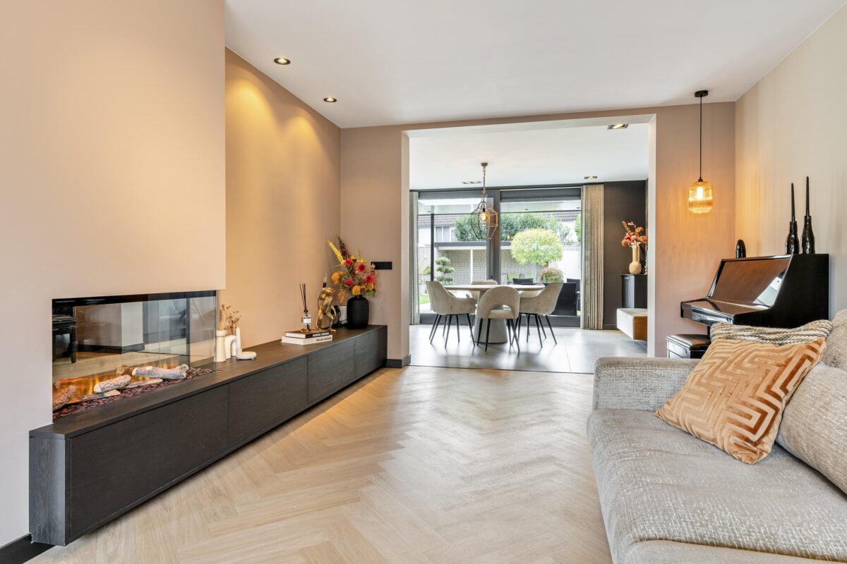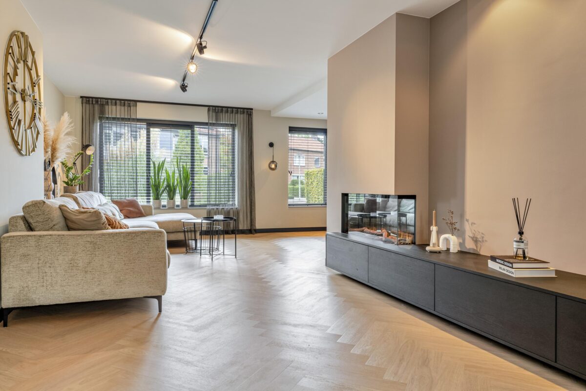 – Ruime, sfeervolle en lichte woonkamer voorzien van visgraat vloer en elektrische haard.