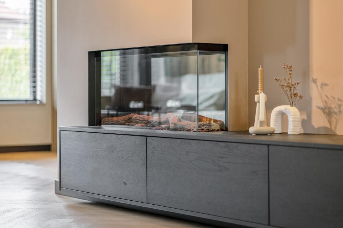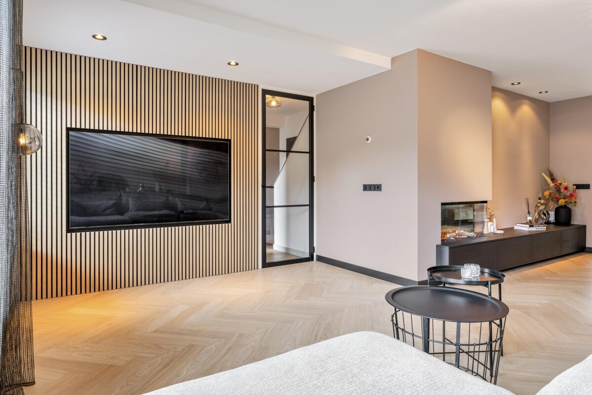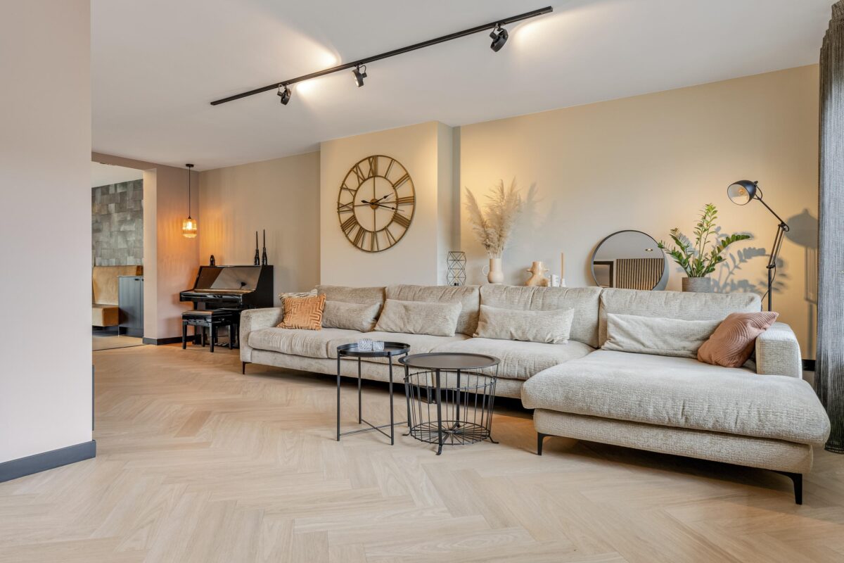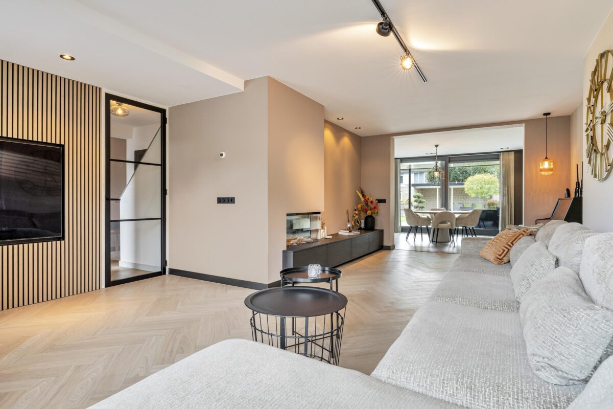 – Ruime, sfeervolle en lichte woonkamer voorzien van visgraat vloer en elektrische haard.