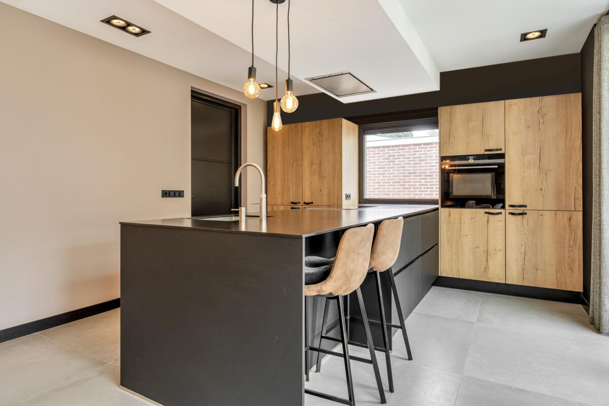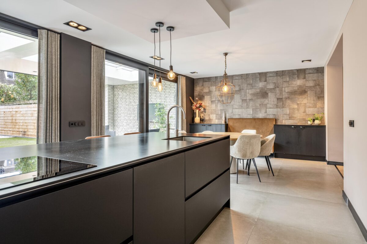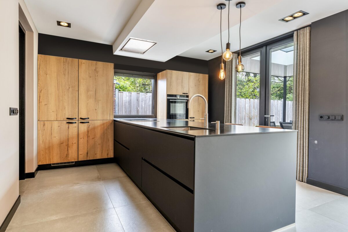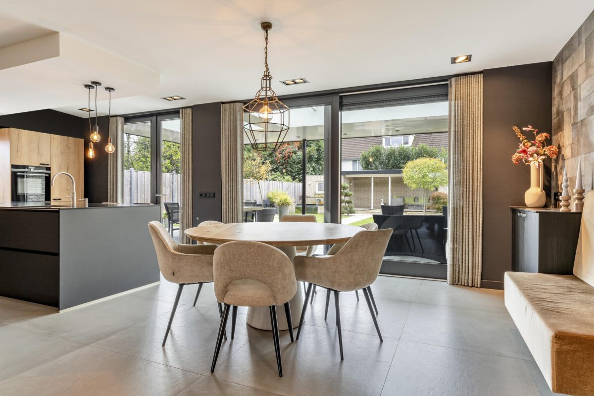 – Riante leefkeuken met zicht op de achtertuin met een grote schuifpui en afgewerkt met een moderne tegelvloer.