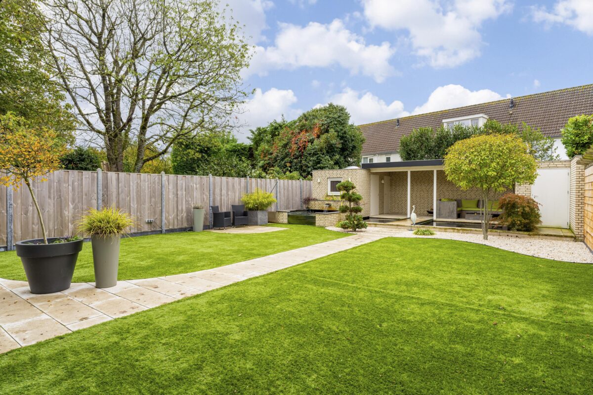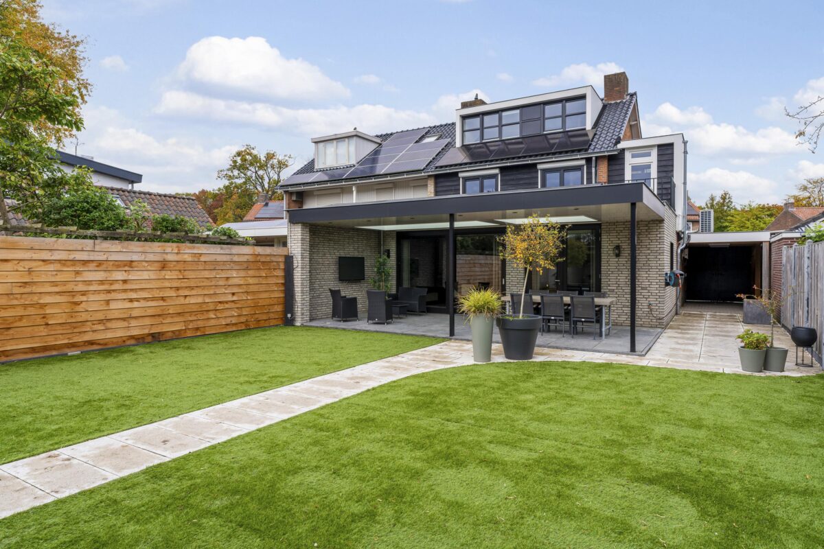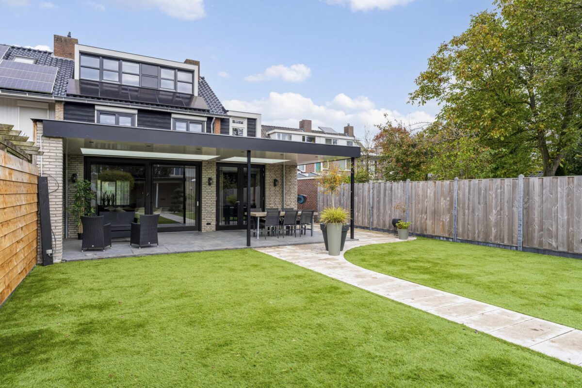– Diepe, royale en fraai aangelegde achtertuin met o.a. een grote overkapping met terras, een overdekte achterom en meerdere tuinbergingen.