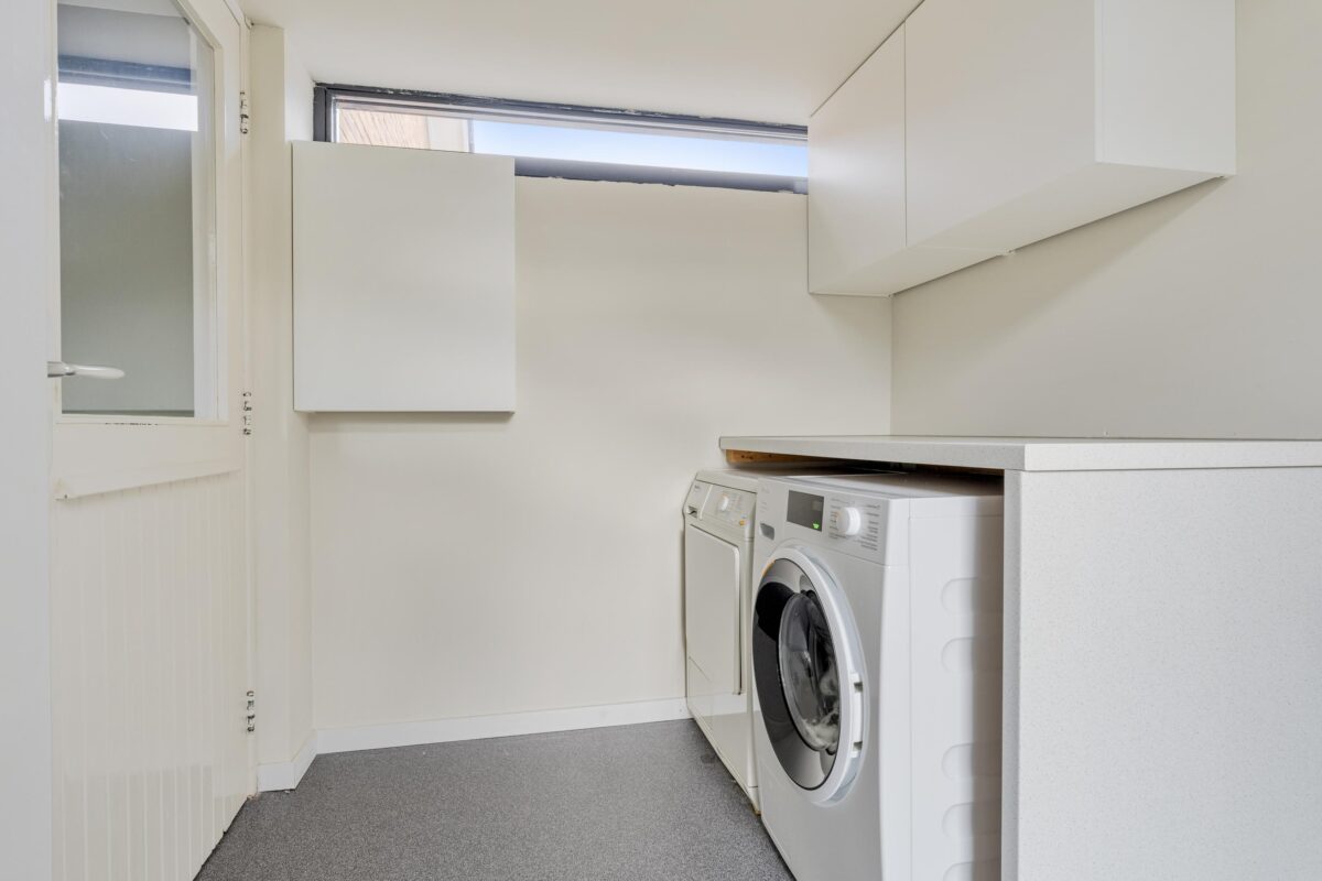 – Bijkeuken met een achterom, trapkast, opstelling van de warmtepomp en toegang tot een toilet.