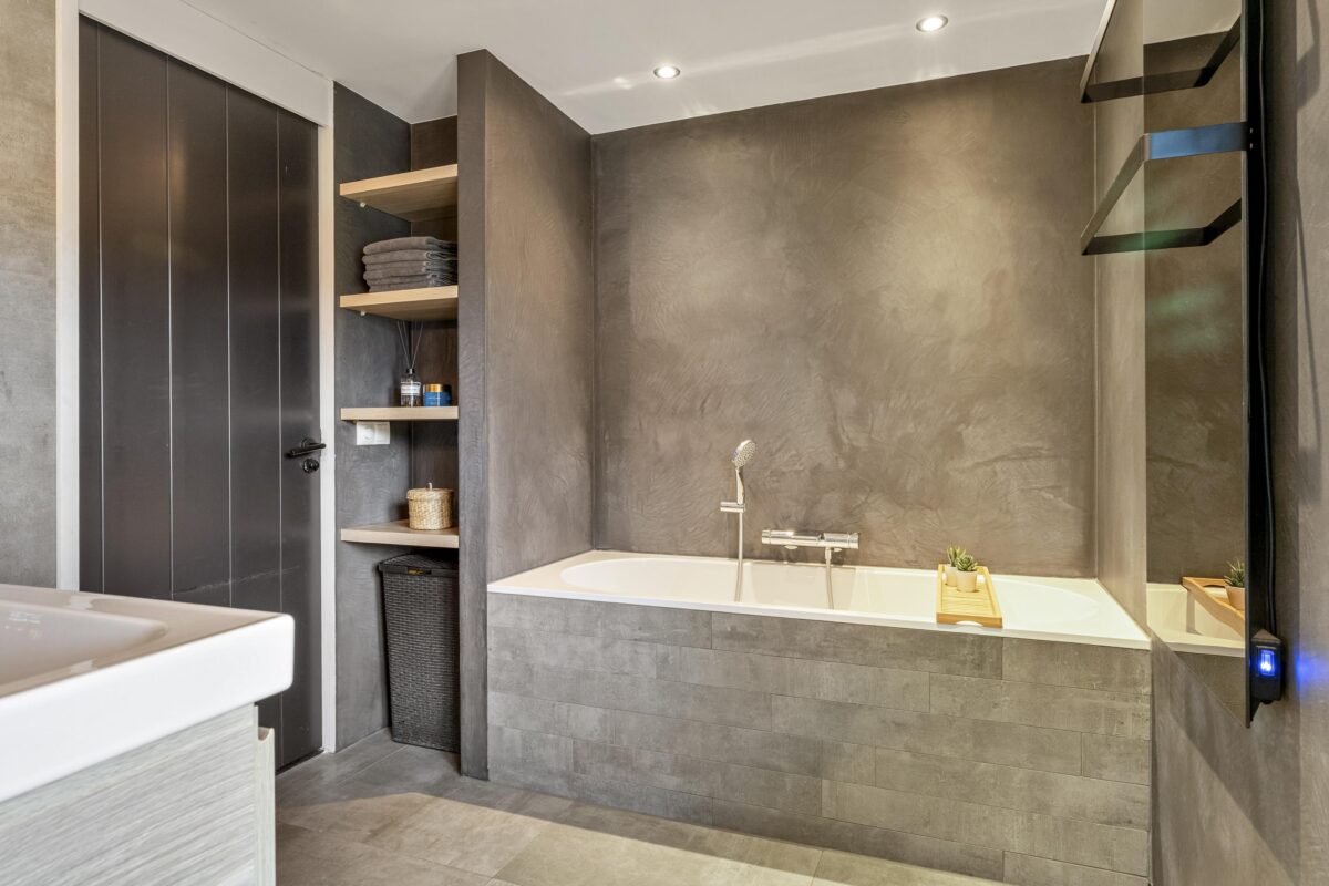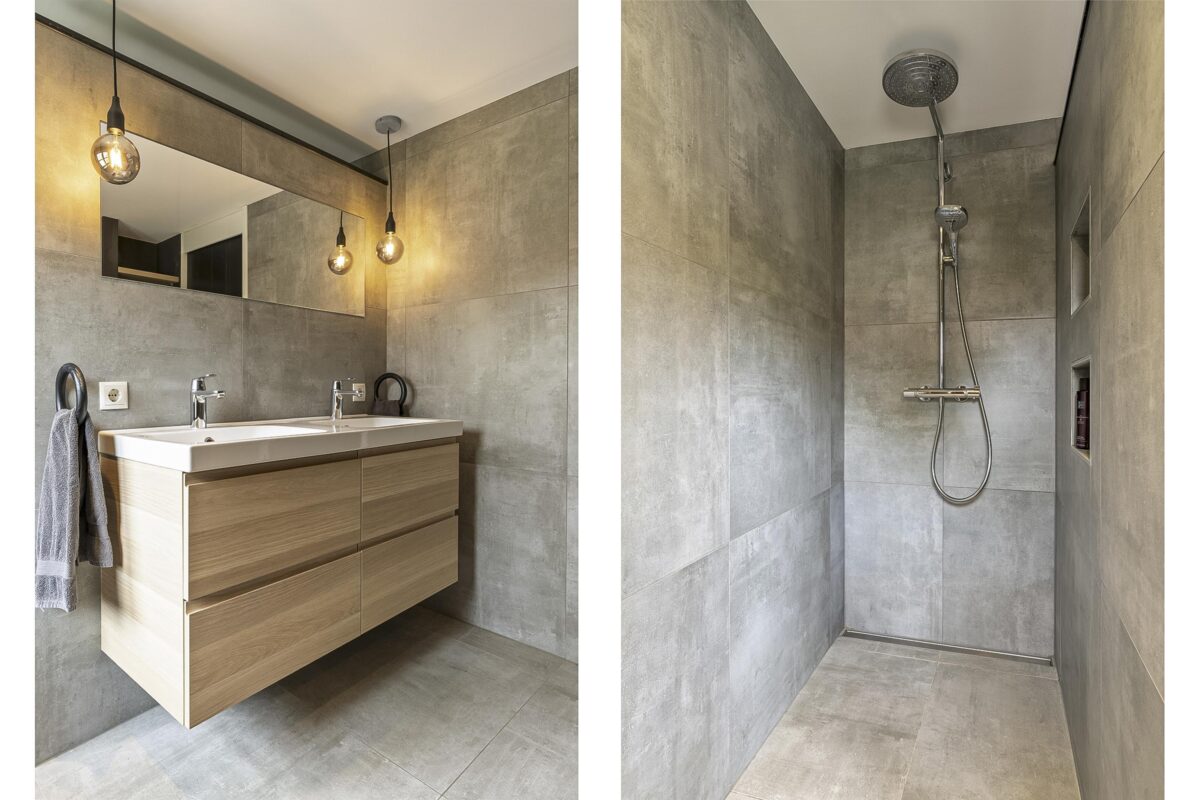 – Smaakvolle badkamer voorzien van een ligbad, inloopdouche, dubbele wastafel met meubel, infrarood warmtepaneel en er is een separaat toilet aanwezig op de overloop.