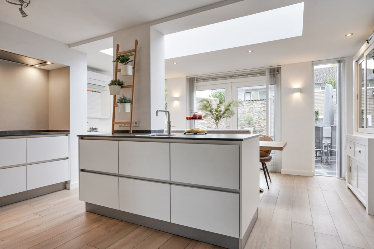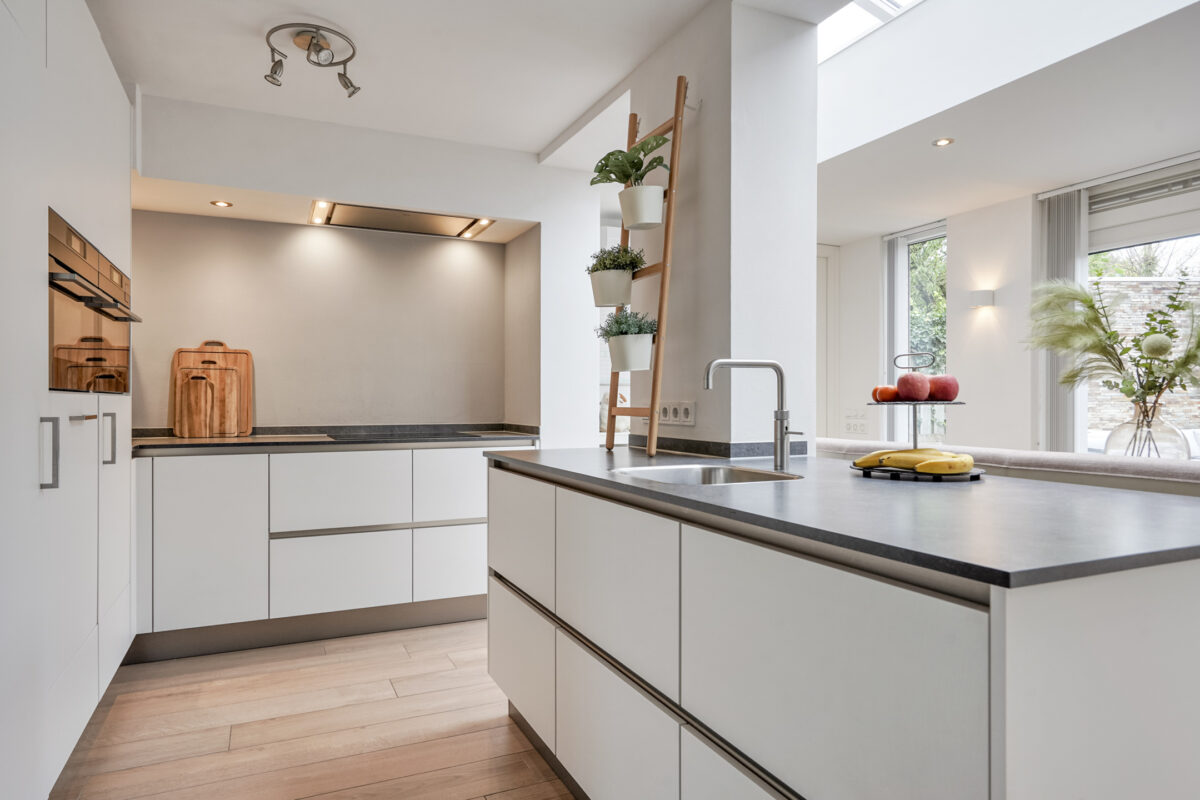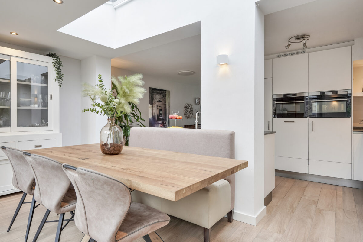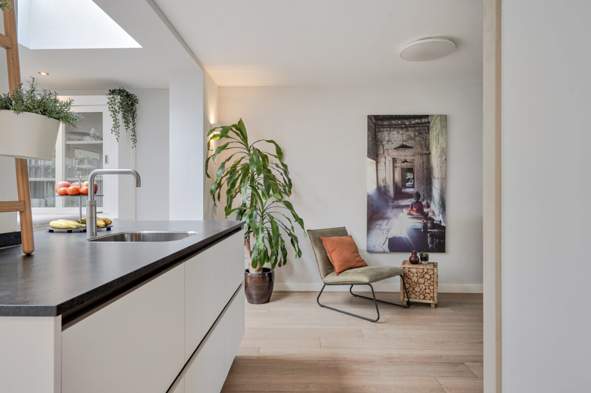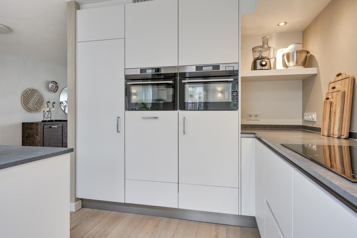 De luxe maatwerkkeuken (2021) is een echte eyecatcher en compleet uitgerust met een combi-stoomoven, combi-oven/magnetron, grote koelkast, Quooker-kraan, slim geplaatste vaatwasser op hoogte, inductiekookplaat en afzuigschouw met directe afvoer naar buiten.