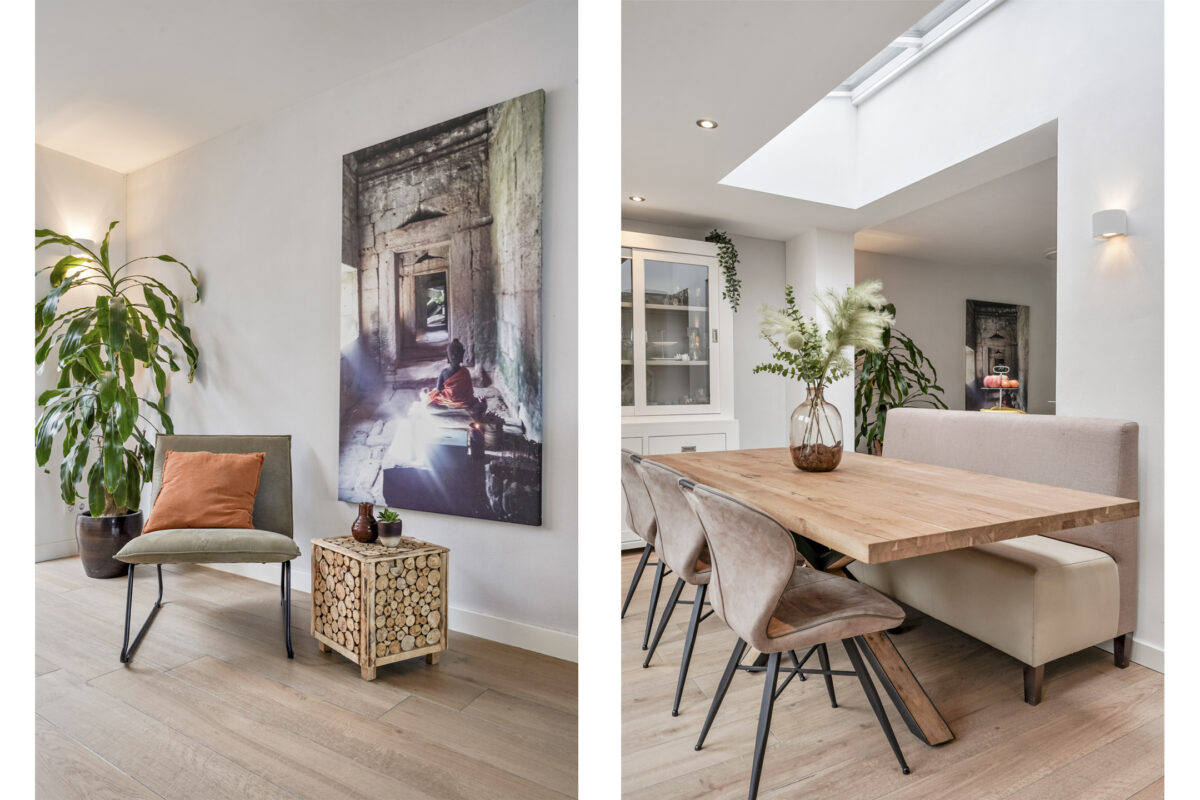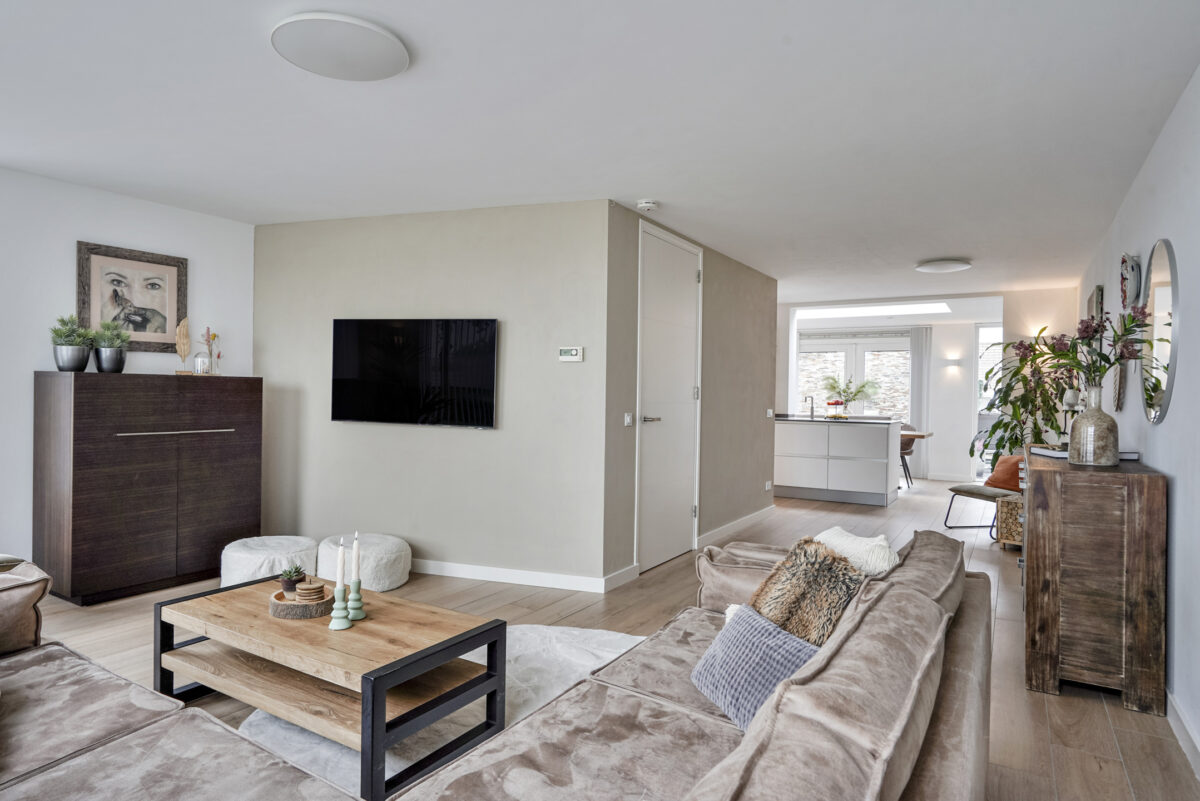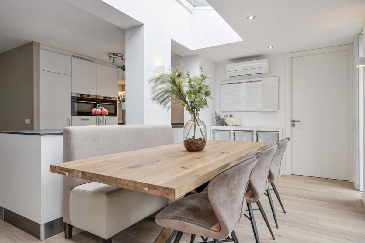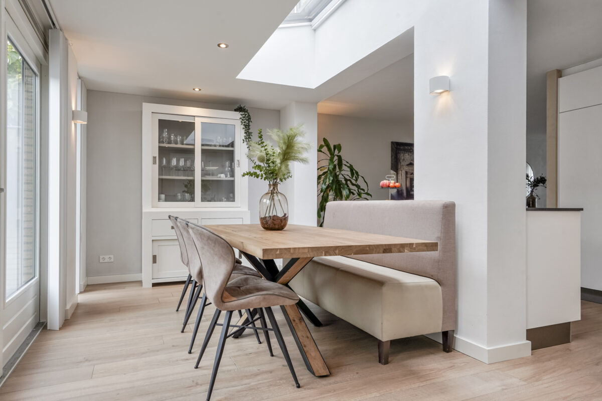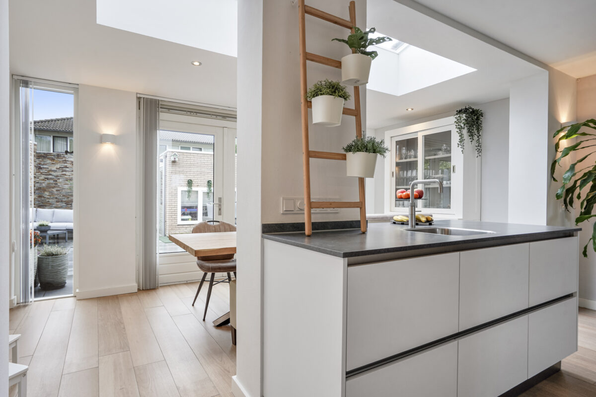 De luxe maatwerkkeuken (2021) is een echte eyecatcher en compleet uitgerust met een combi-stoomoven, combi-oven/magnetron, grote koelkast, Quooker-kraan, slim geplaatste vaatwasser op hoogte, inductiekookplaat en afzuigschouw met directe afvoer naar buiten.