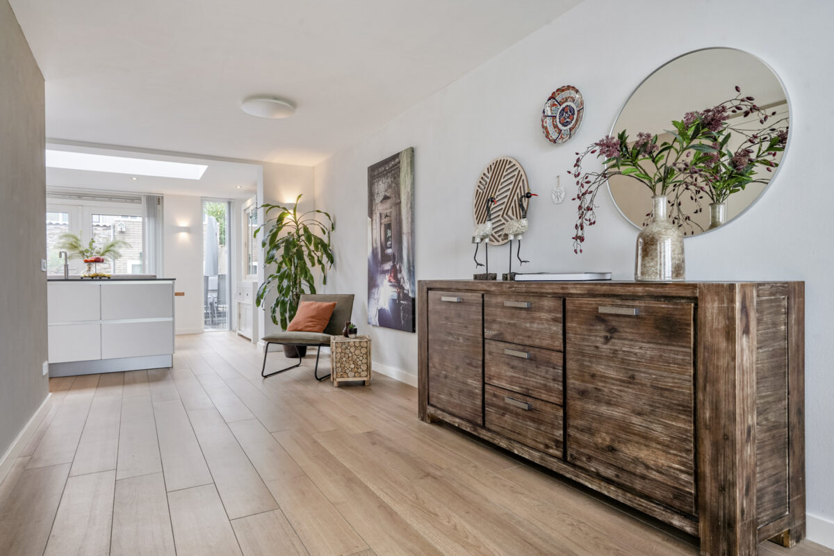 Ruime entree/hal met garderobe, toilet en trapopgang. De royale uitgebouwde woonkamer is voorzien van een stijlvolle plavuizen vloer met houtnerfstructuur, comfortabele vloerverwarming over de gehele begane grond en een airconditioning. Dankzij de grote raampartijen, de lichtstraat met elektrisch screen en openslaande tuindeuren is er volop lichtinval en contact met buiten.