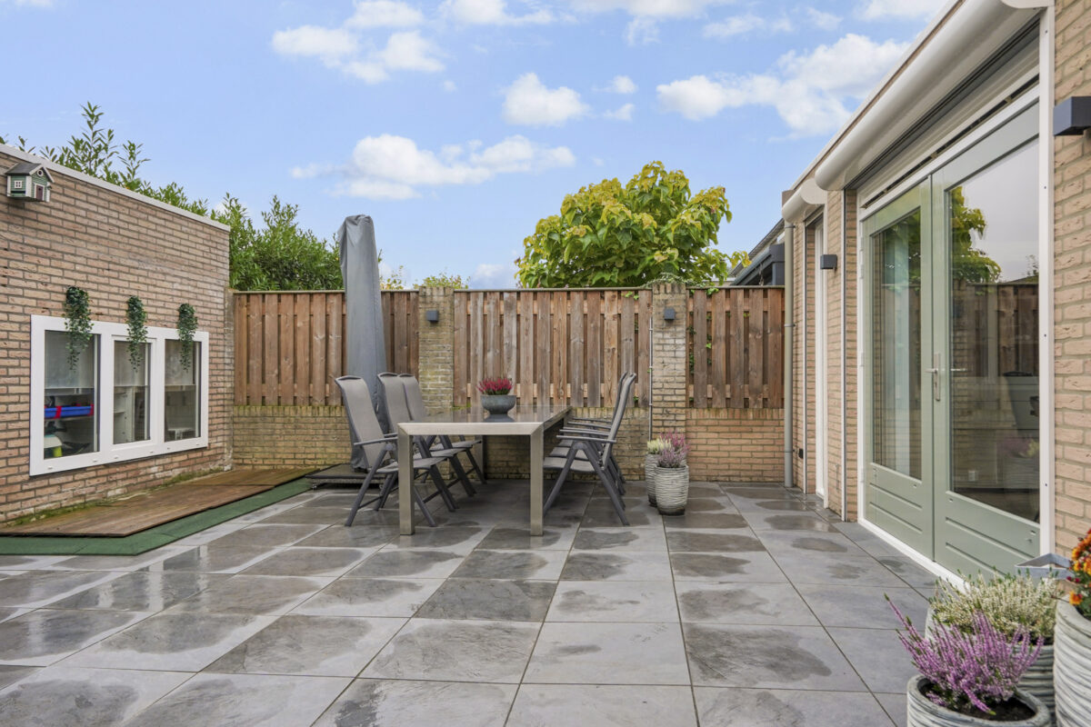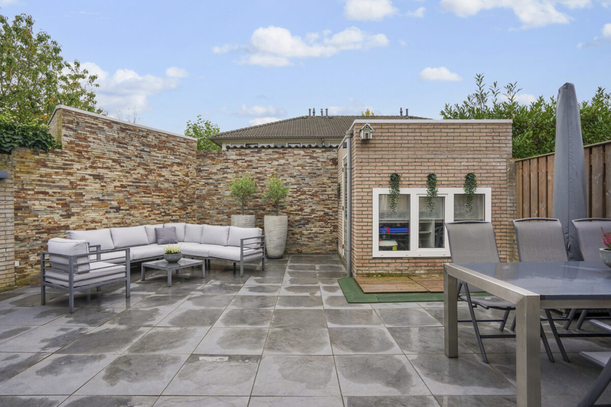 De woning beschikt over een voor-, zij- en achtertuin met achterom. De achtertuin ligt op het zuidoosten, is ruim opgezet (ca. 8,71 m diep en 8,85 m breed), onderhoudsarm aangelegd en biedt volop privacy. De vrijstaande stenen berging beschikt over elektra en wateraansluiting, ideaal voor hobby’s of opslag.