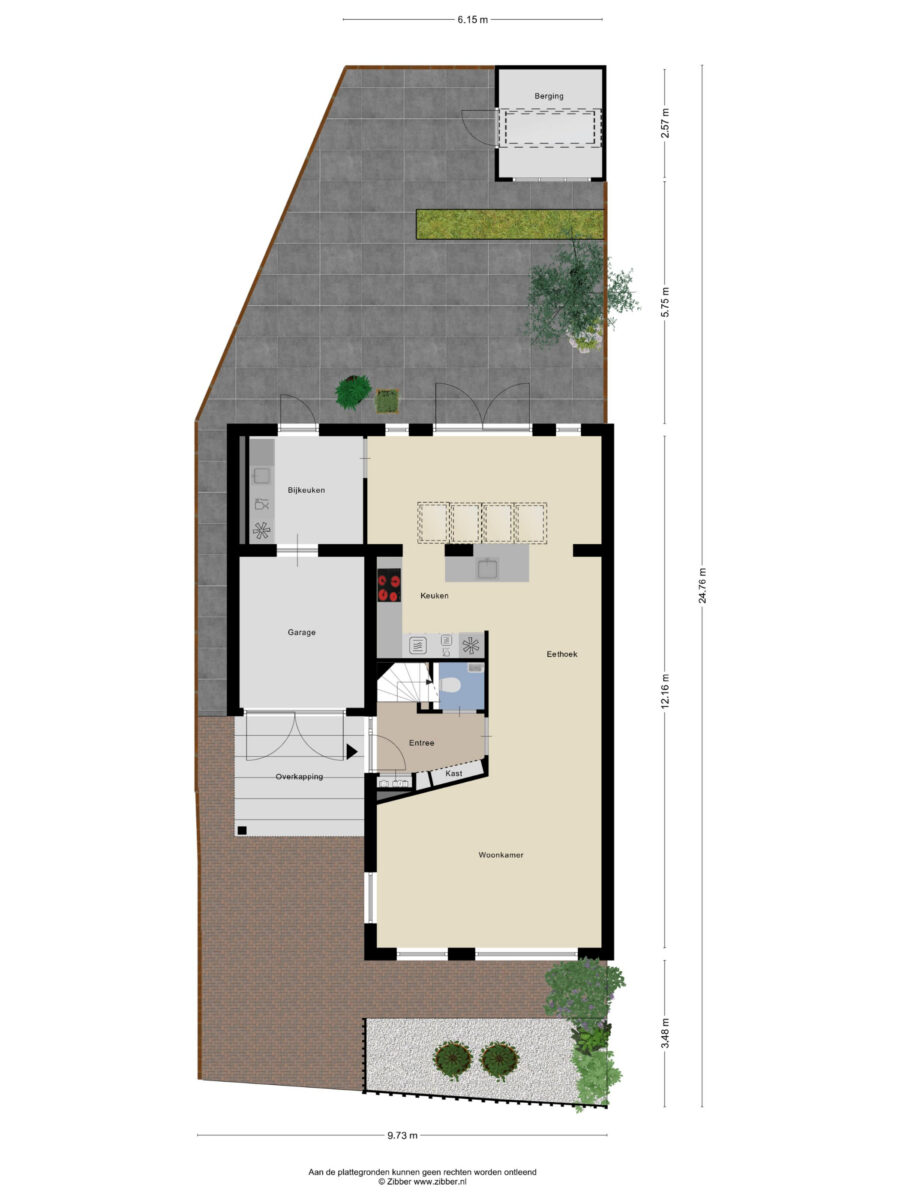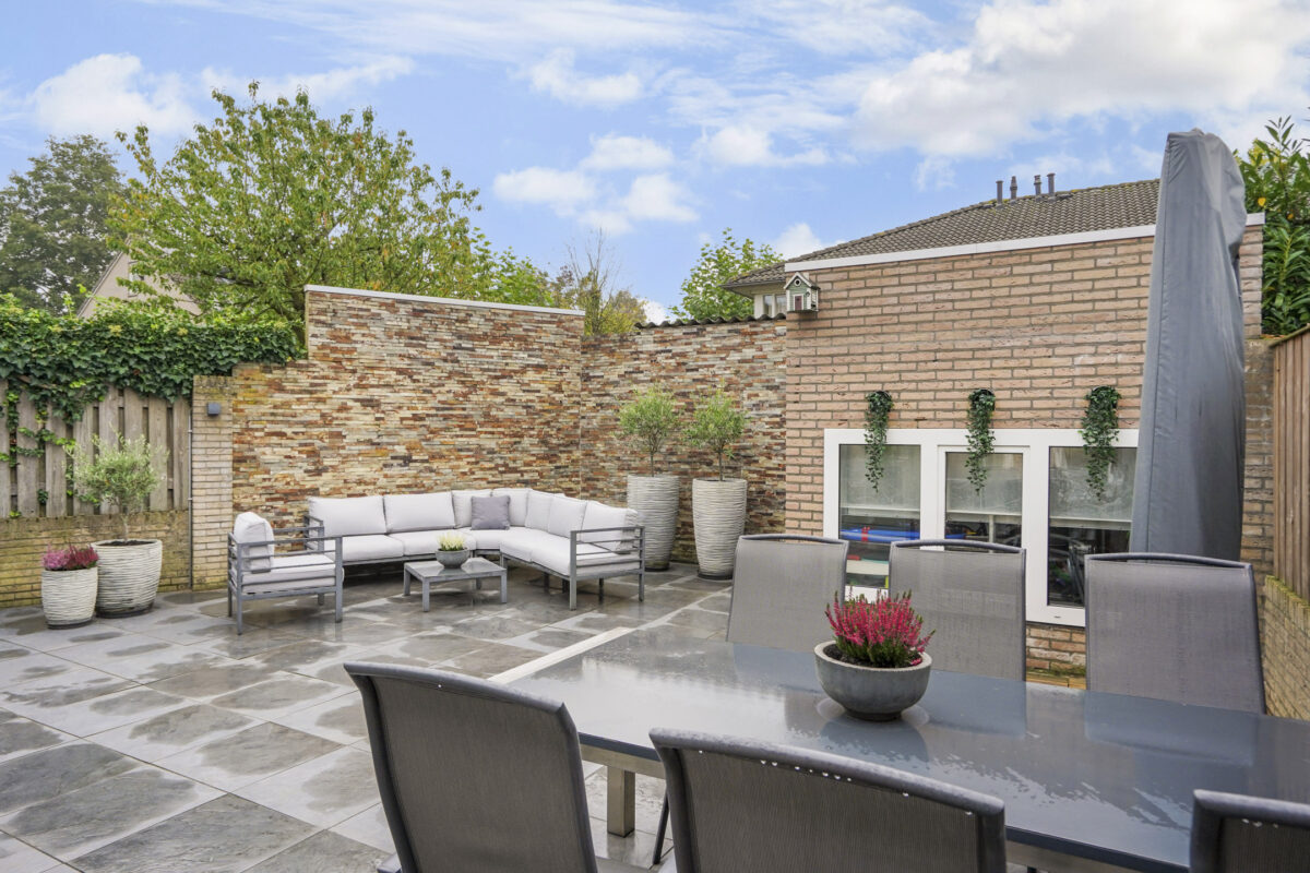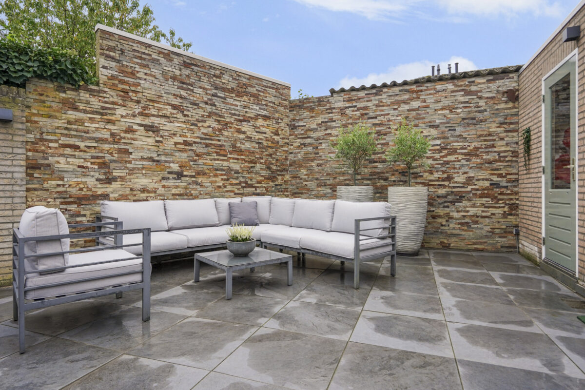 Grote onderhoudsarme achtertuin met veel privacy en achterom