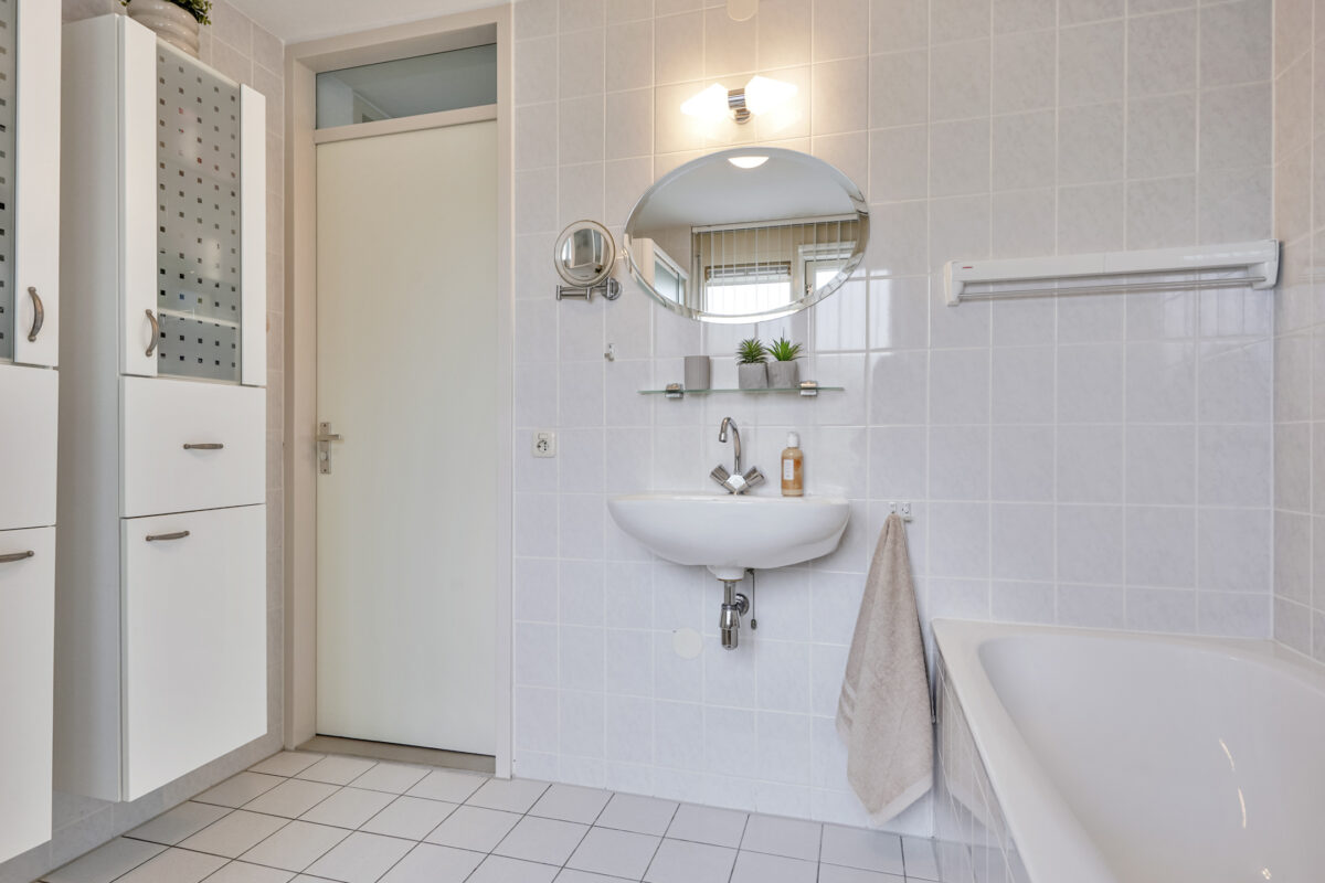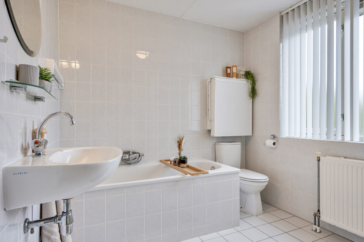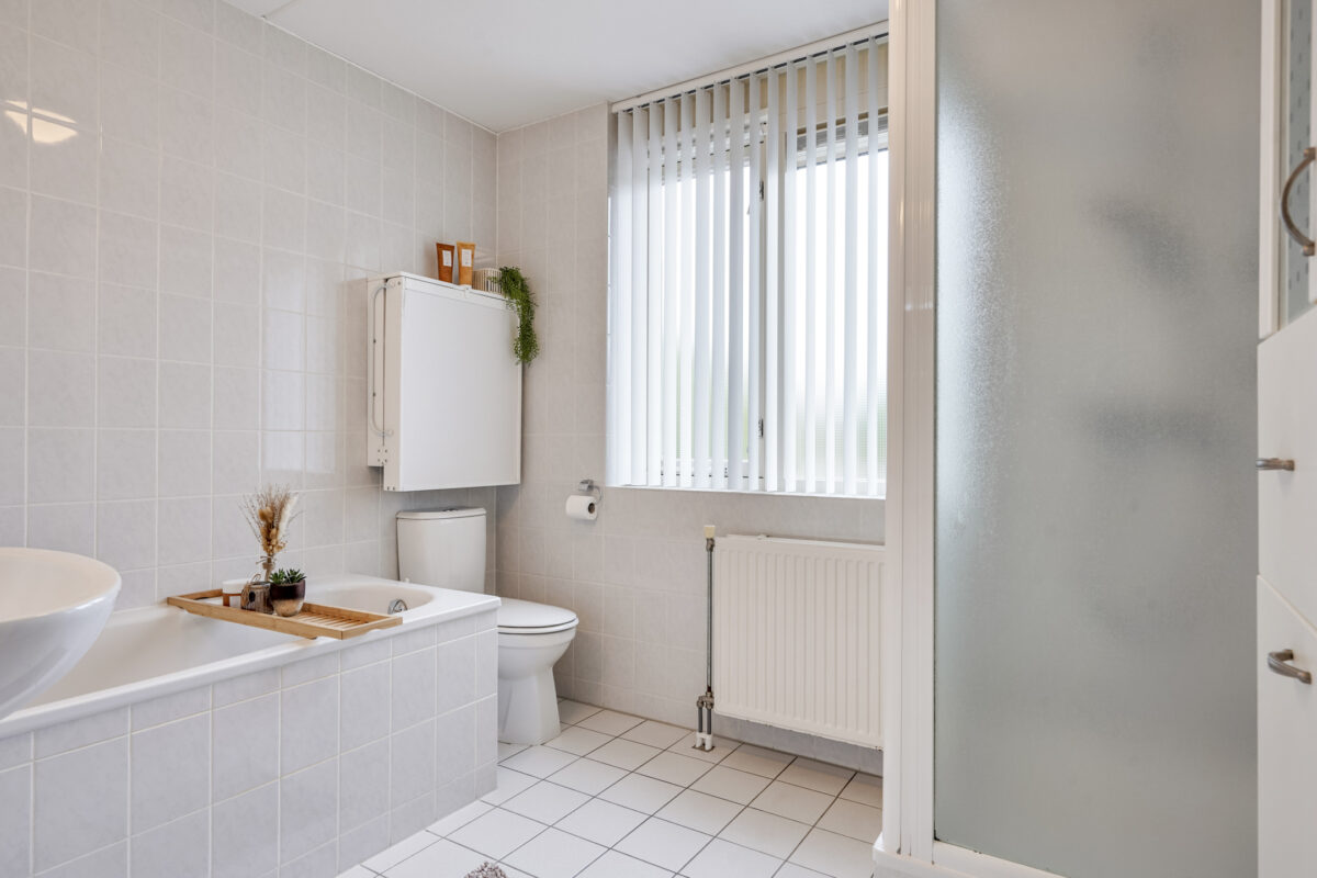 De badkamer (ca. 2.42 x 2.82 m) is compleet betegeld en voorzien van een ligbad, douchecabine, tweede toilet en wastafel.