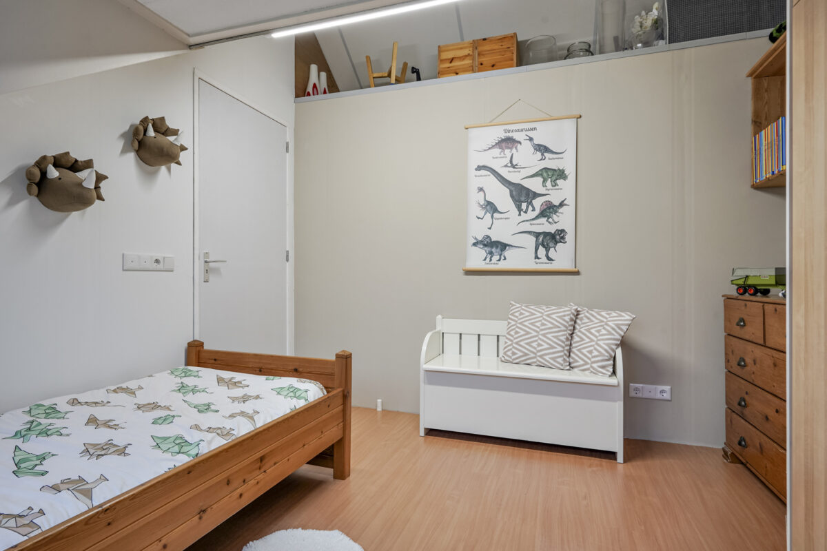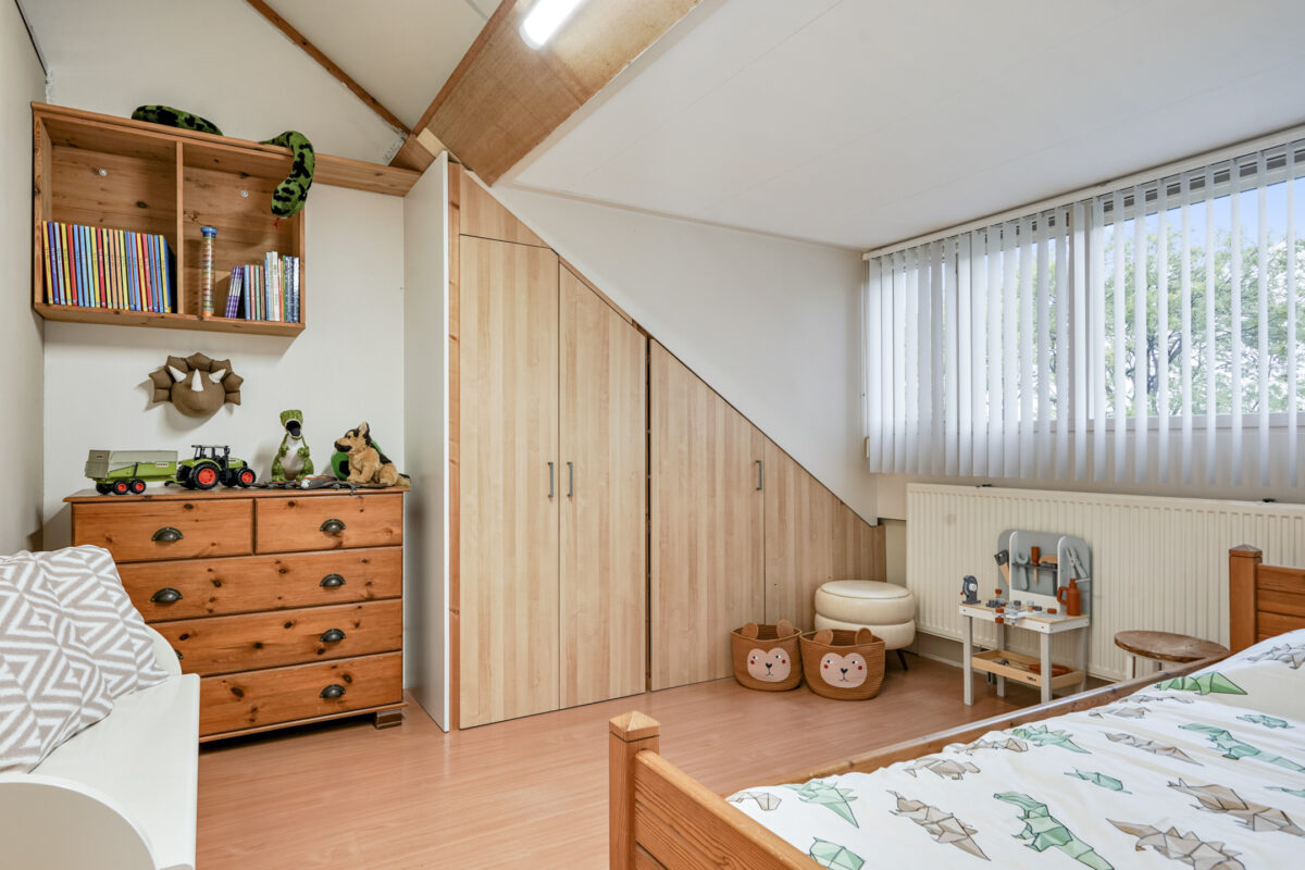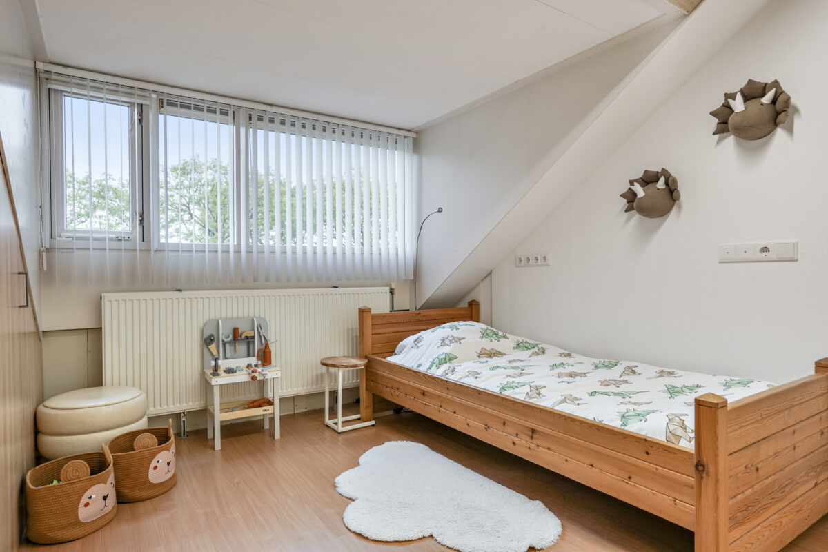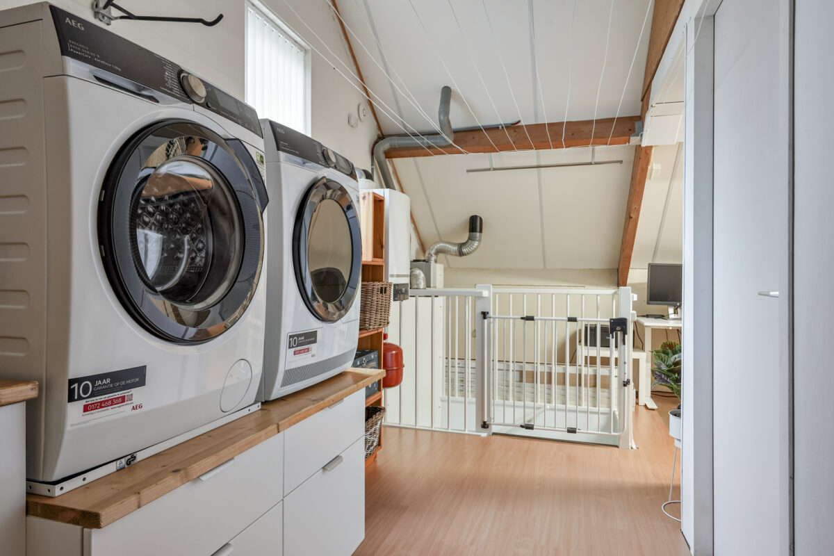 Via een vaste trap bereikt u de tweede verdieping met overloop, CV-opstelling (Nefit TopLine), wasmachine- en drogeraansluiting en een ruime vierde (slaap)kamer met dakkapel en bergruimte achter de knieschotten.