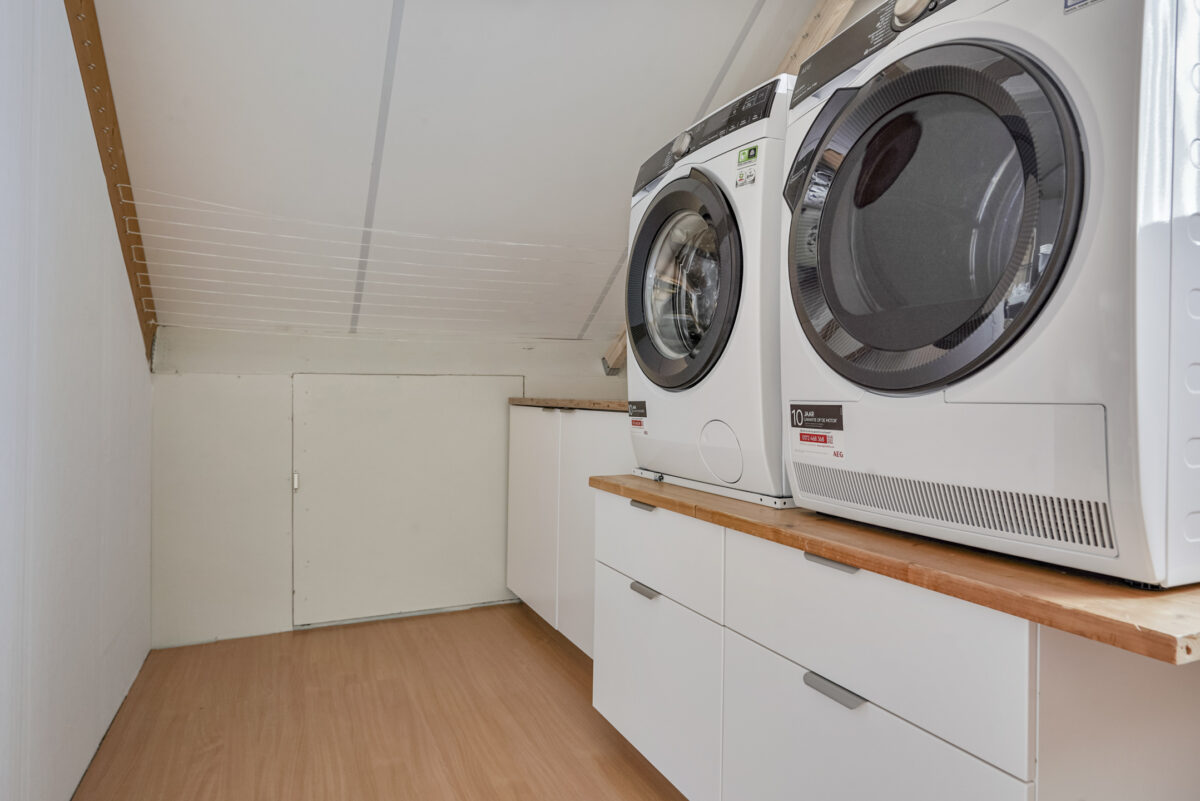 Een gedeelte van de voormalige garage is praktisch ingedeeld als multifunctionele werk-/speelkamer met een extra kitchenette voorzien van spoelbak met mengkraan, tweede vaatwasser en grote vriezer, en daarnaast een royale inpandige berging met 3-puntssluitingen op de deuren.