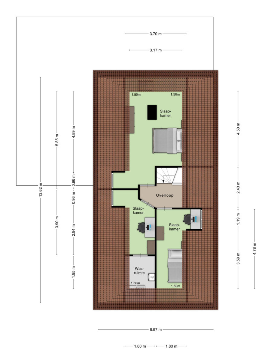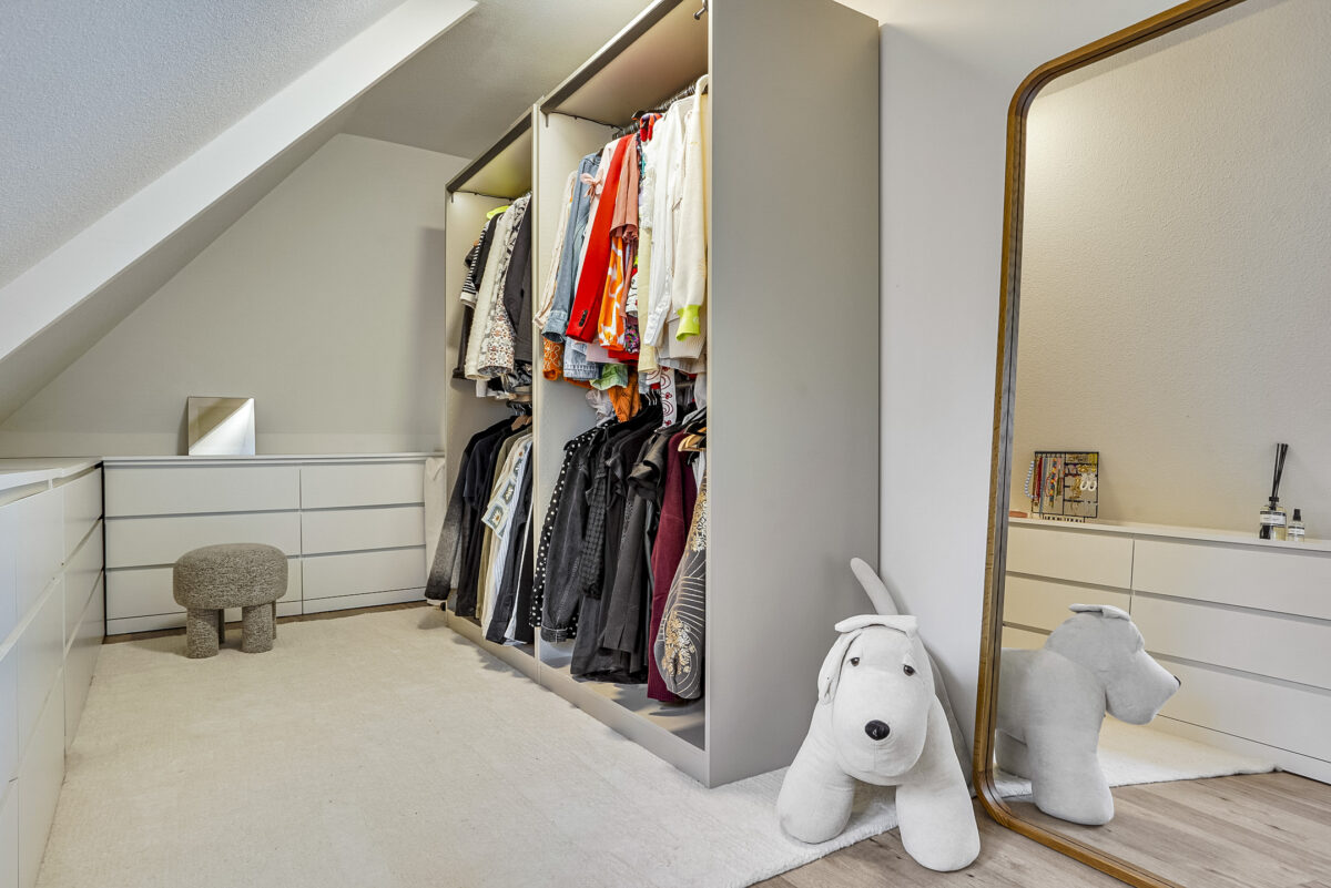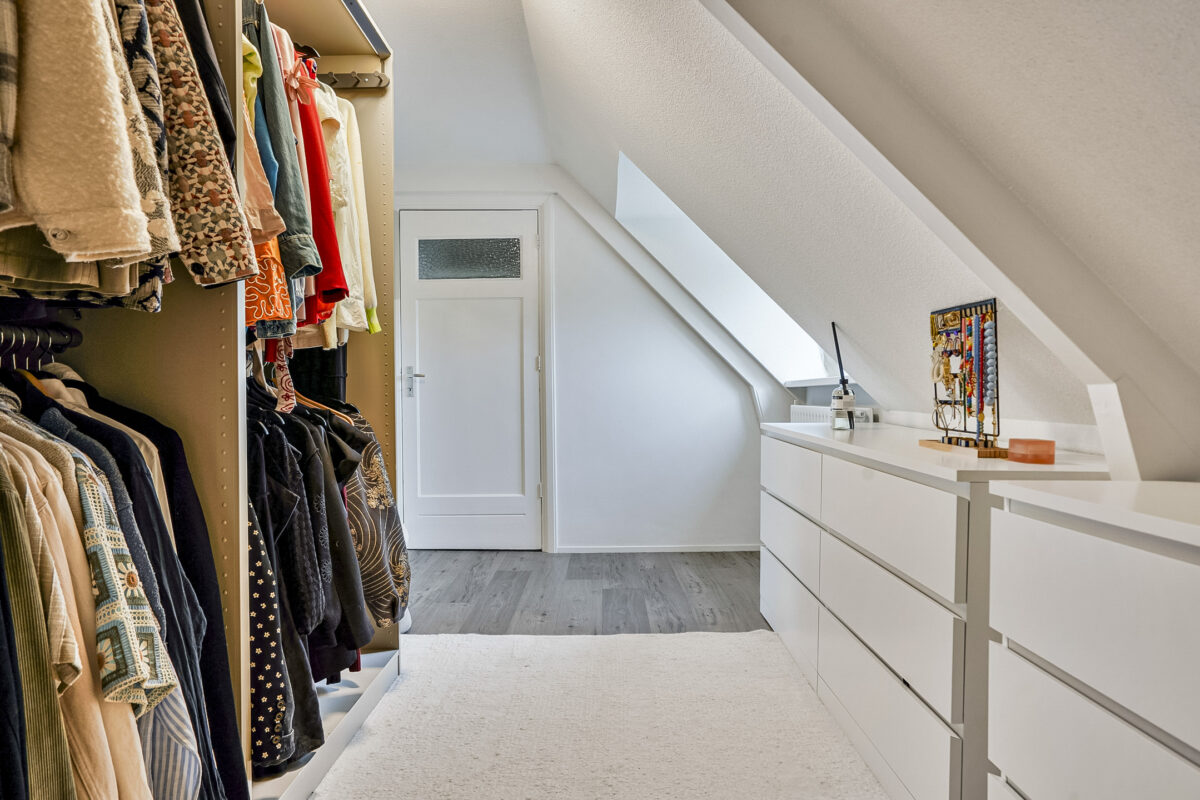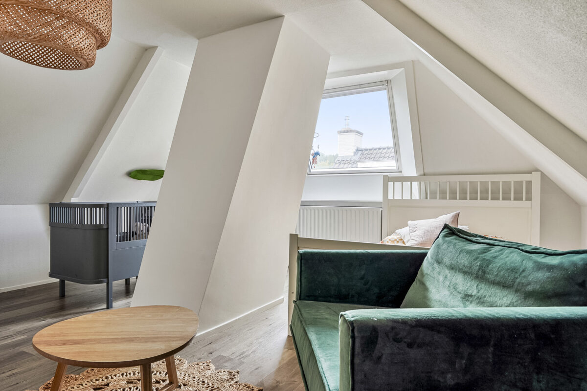 De overloop geeft toegang tot drie slaapkamers met dakkapel. De grootste slaapkamer heeft een extra dakraam. De tweede slaapkamer wordt momenteel gebruikt als kledingkamer. De derde slaapkamer heeft toegang tot een berging met wasmachine- en drogeraansluiting en de cv-ketel.