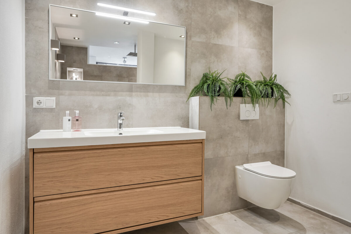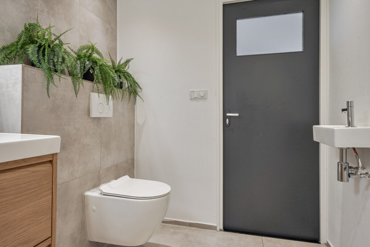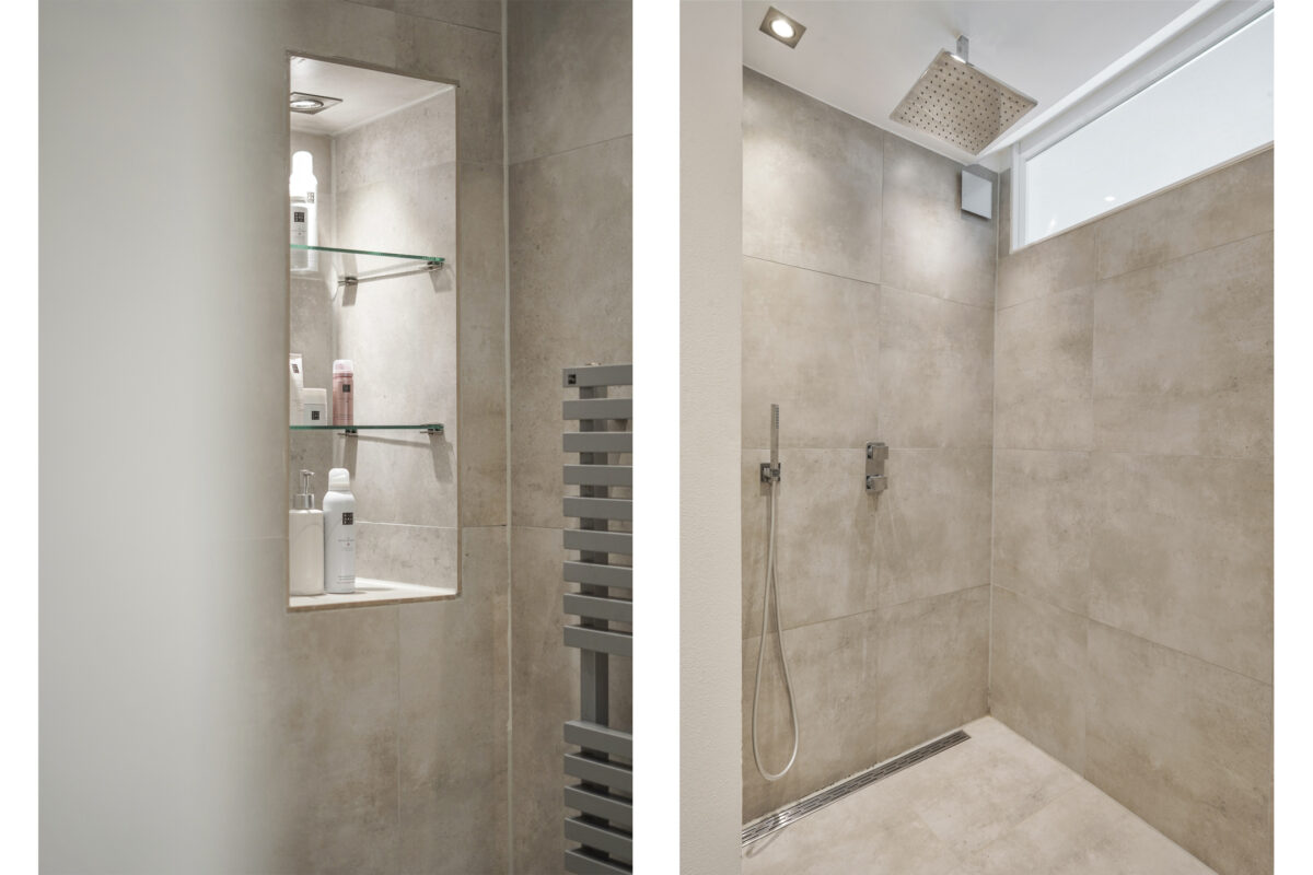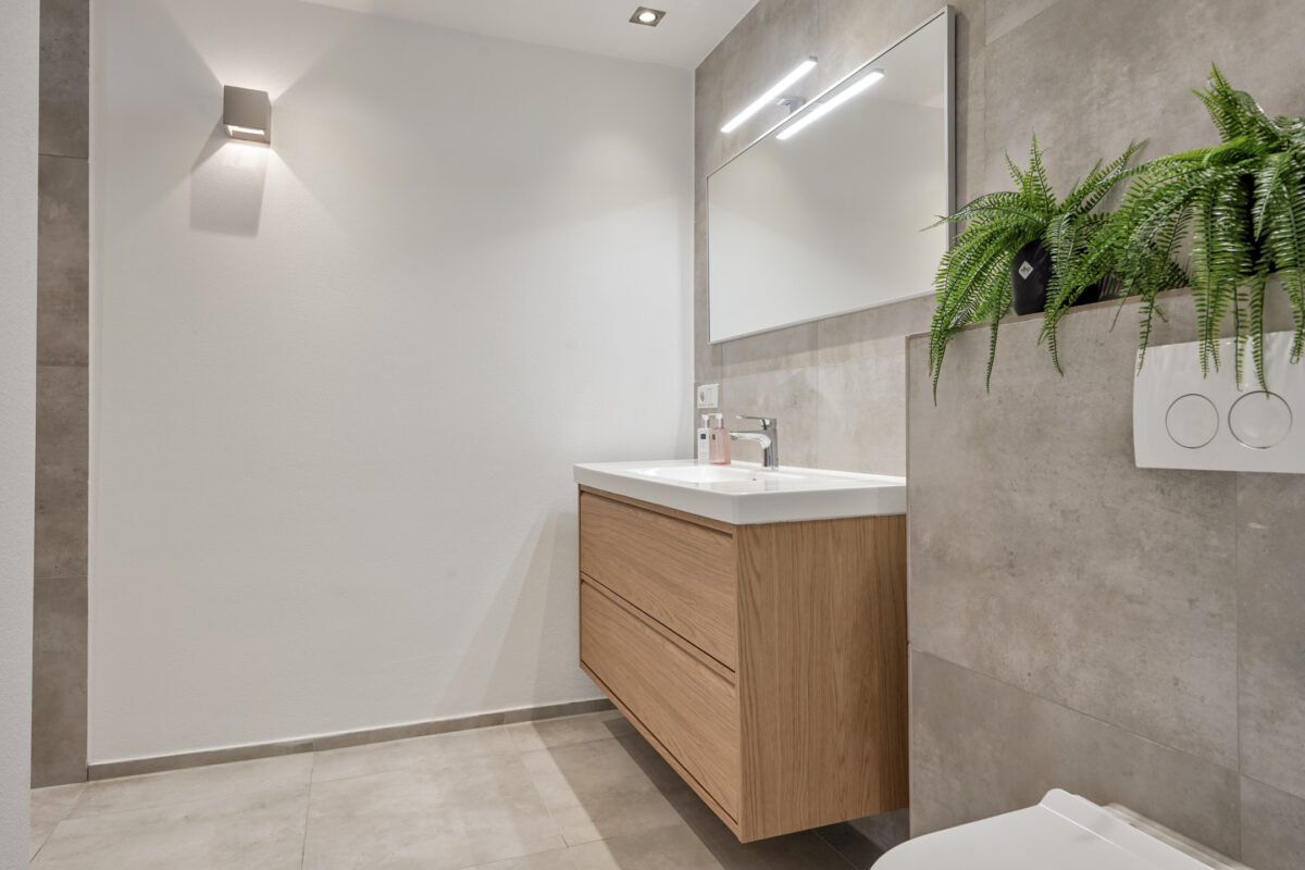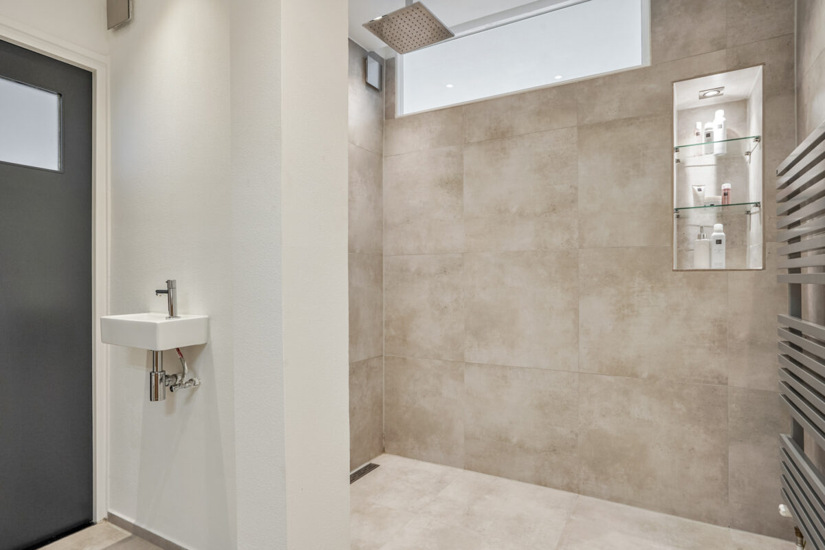 De badkamer is een waar pareltje: strak afgewerkt met grote grijze wandtegels, dimbare inbouwspots, een moderne inloopdouche met regendouche, een breed wastafelmeubel met spiegelverlichting en een zwevend toilet. De designradiator zorgt ervoor dat ook je handdoek altijd lekker warm is.