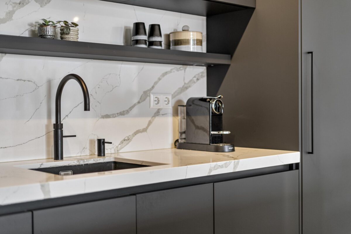 – Luxe Rotpunkt-keuken met composiet werkblad (Calacatta) en o.a. Bora inductiekookplaat, Quooker Cube, Liebherr koel/vriescombinatie met ijsblokjesmachine, wijnklimaatkast, Miele vaatwasser en combi oven/magnetron