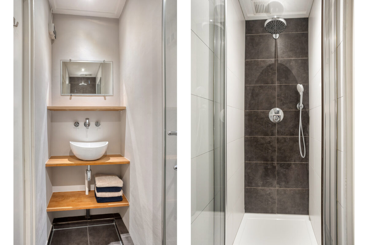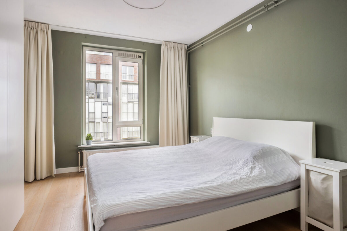 Het appartement beschikt over twee ruime slaapkamers, gesitueerd aan zowel de voor- als achterzijde, die beide een rustige en comfortabele sfeer bieden. De in 2025 gemoderniseerde badkamer is uitgerust met een ruime inloopdouche en een wastafelmeubel, waarbij het strak ingefreesde kraanwerk zorgt voor een luxe uitstraling. Daarnaast is er een separaat toilet, sfeervol afgewerkt met een karakteristiek Portugees tegelvloertje.