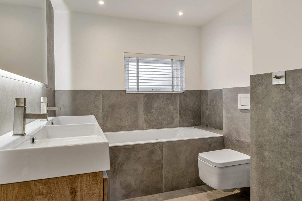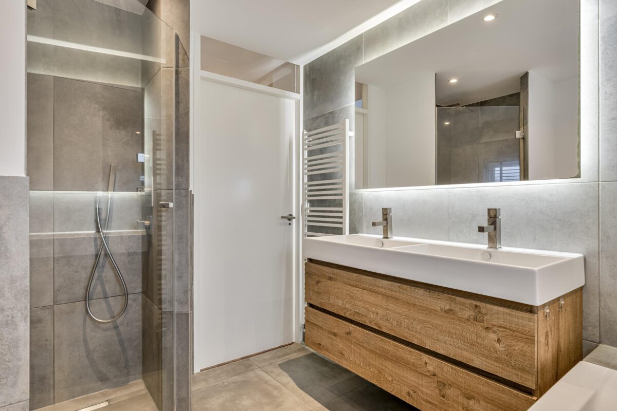 – Een eigentijdse badkamer met fraai tegelwerk en voorzien van een extra ruim ligbad, dubbele wastafel met meubel, inloopdouche en een toilet
