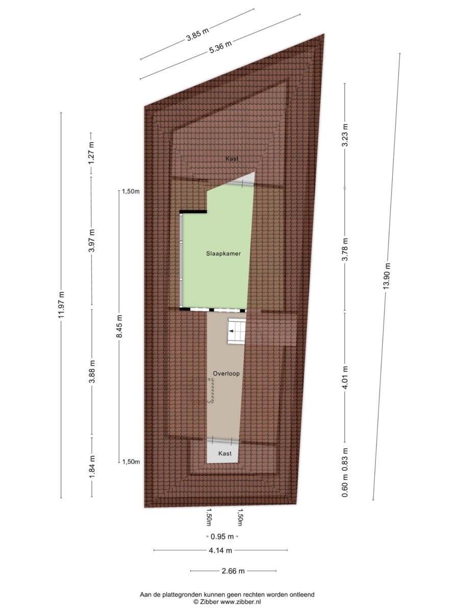 Volgens de NEN-meetinstructie wordt deze ruimte formeel beschouwd als overige inpandige ruimte, omdat de plafondhoogte circa 1,93 meter bedraagt en daarmee iets onder de norm van 2 meter blijft. Hoewel deze verdieping juridisch niet tot het gebruiksoppervlakte wonen behoort, biedt zij in de praktijk een zeer bruikbare en waardevolle extra ruimte.