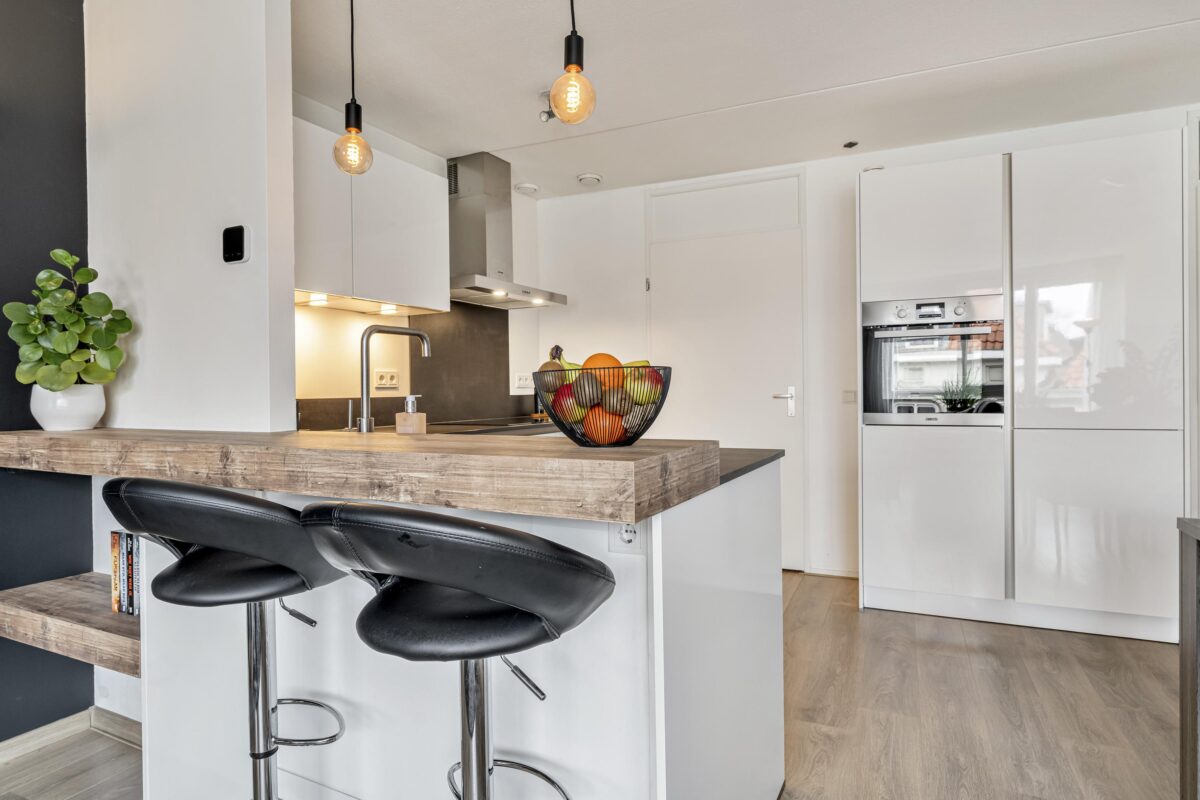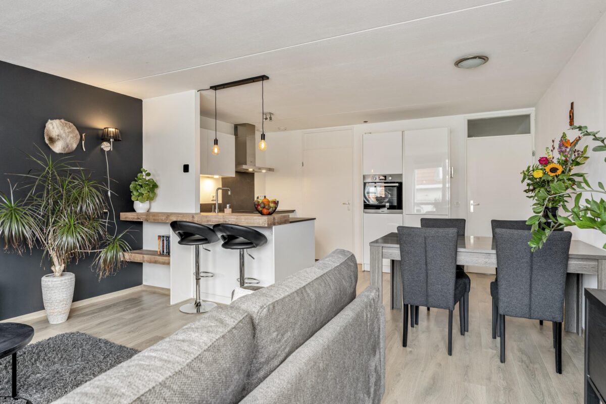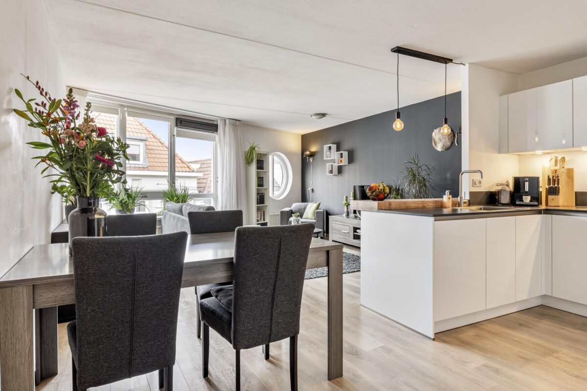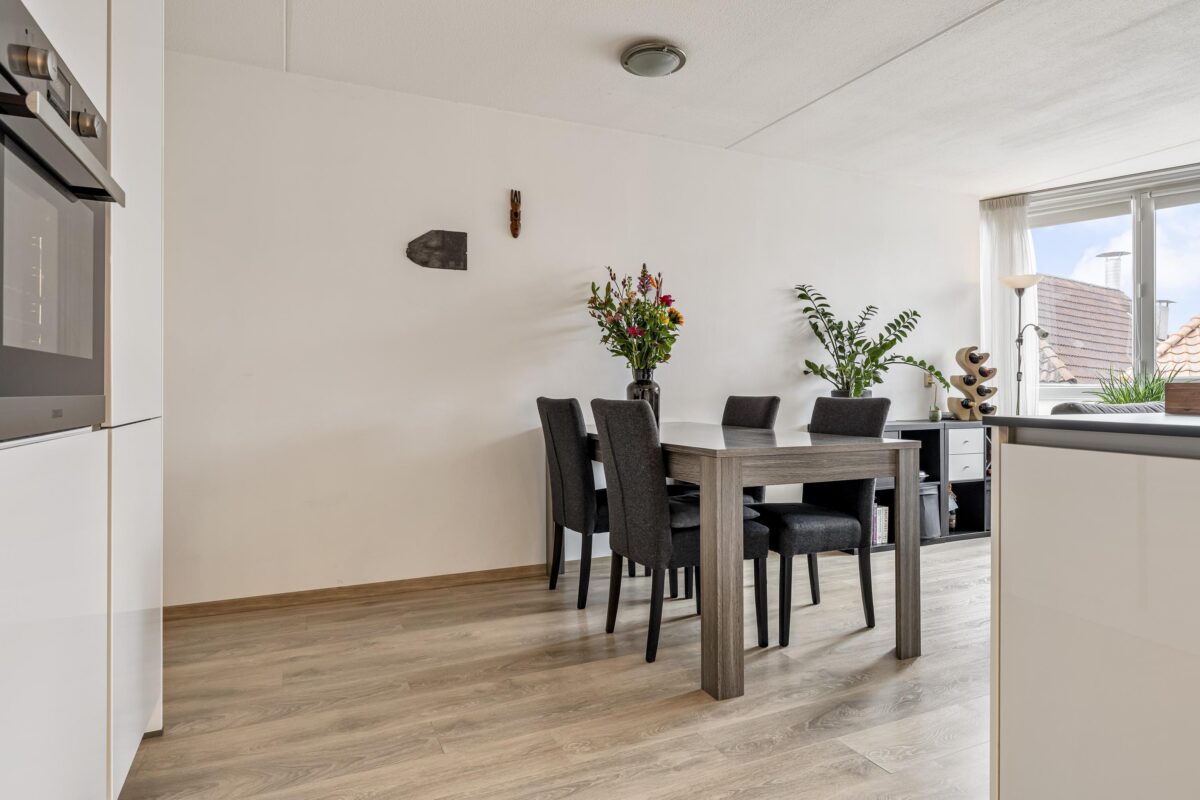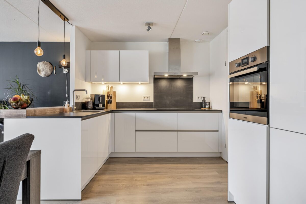 Het appartement zelf is licht, sfeervol en verzorgd afgewerkt. De ruime woonkamer biedt plaats aan zowel een comfortabele zithoek als een eethoek en is voorzien van een nette laminaatvloer. De moderne open keuken (2020) beschikt over onder meer een 5-pits inductiekookplaat, grote oven, koelkast, vriezer en vaatwasser. Aansluitend bevindt zich een praktische bijkeuken met opstelling voor de wasapparatuur.