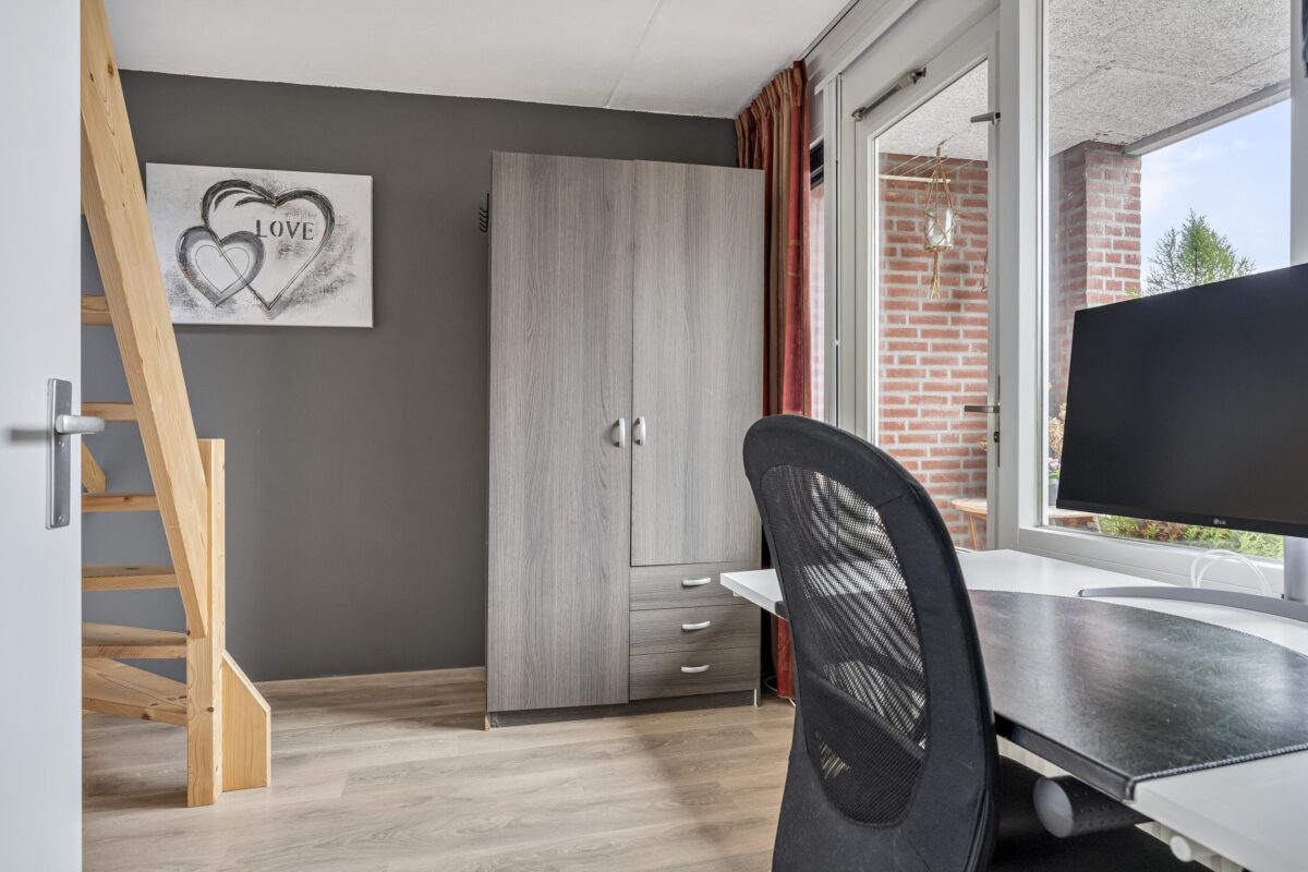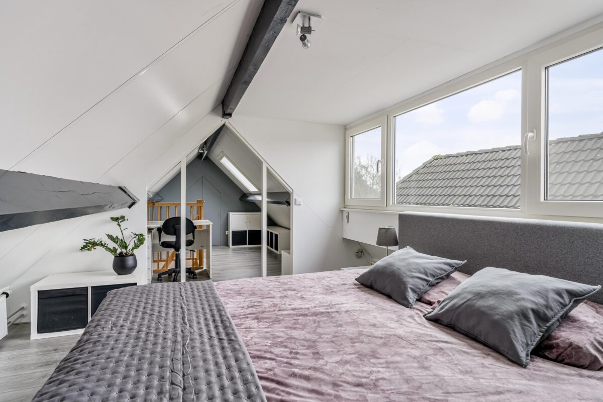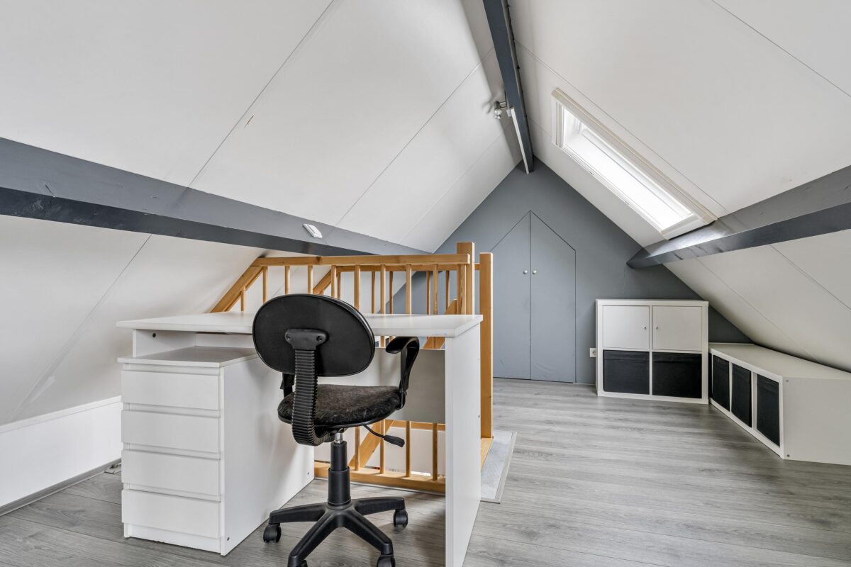 De zolderverdieping is dankzij een grote kunststof dakkapel van circa 3 meter met elektrisch rolluik en dakraam uitgegroeid tot een uitstekend bruikbare extra ruimte. In de praktijk wordt deze verdieping gebruikt als hoofdslaapkamer met een praktische studie-/werkplek en twee ruime bergkasten. Deze verdieping draagt daarmee duidelijk bij aan het wooncomfort en de totale woonbeleving.