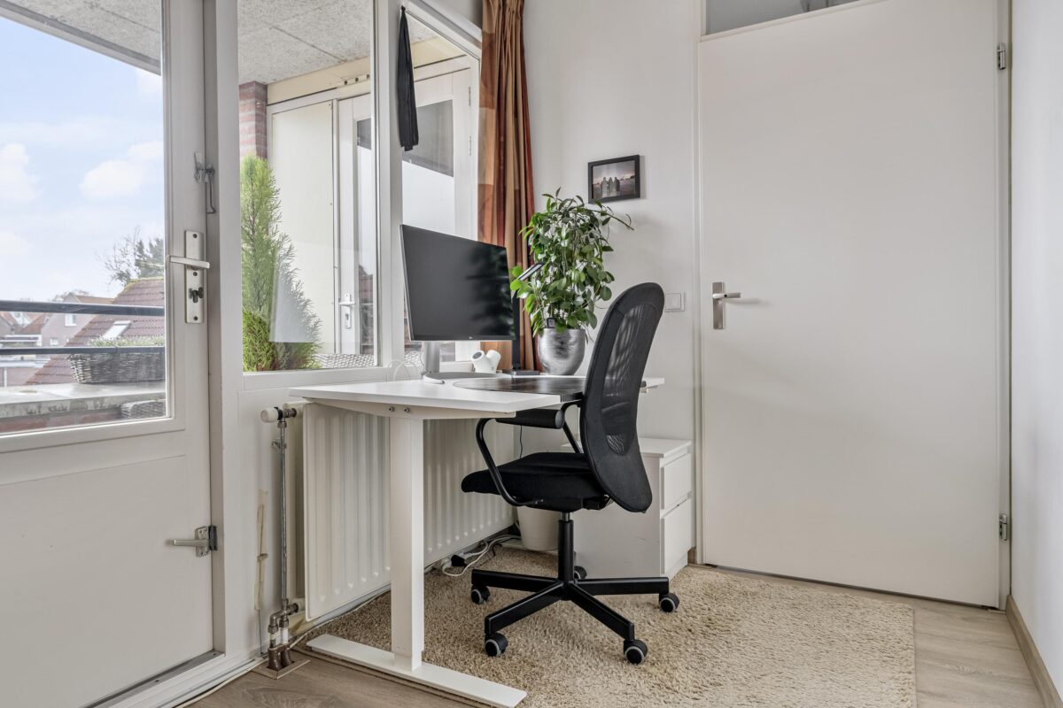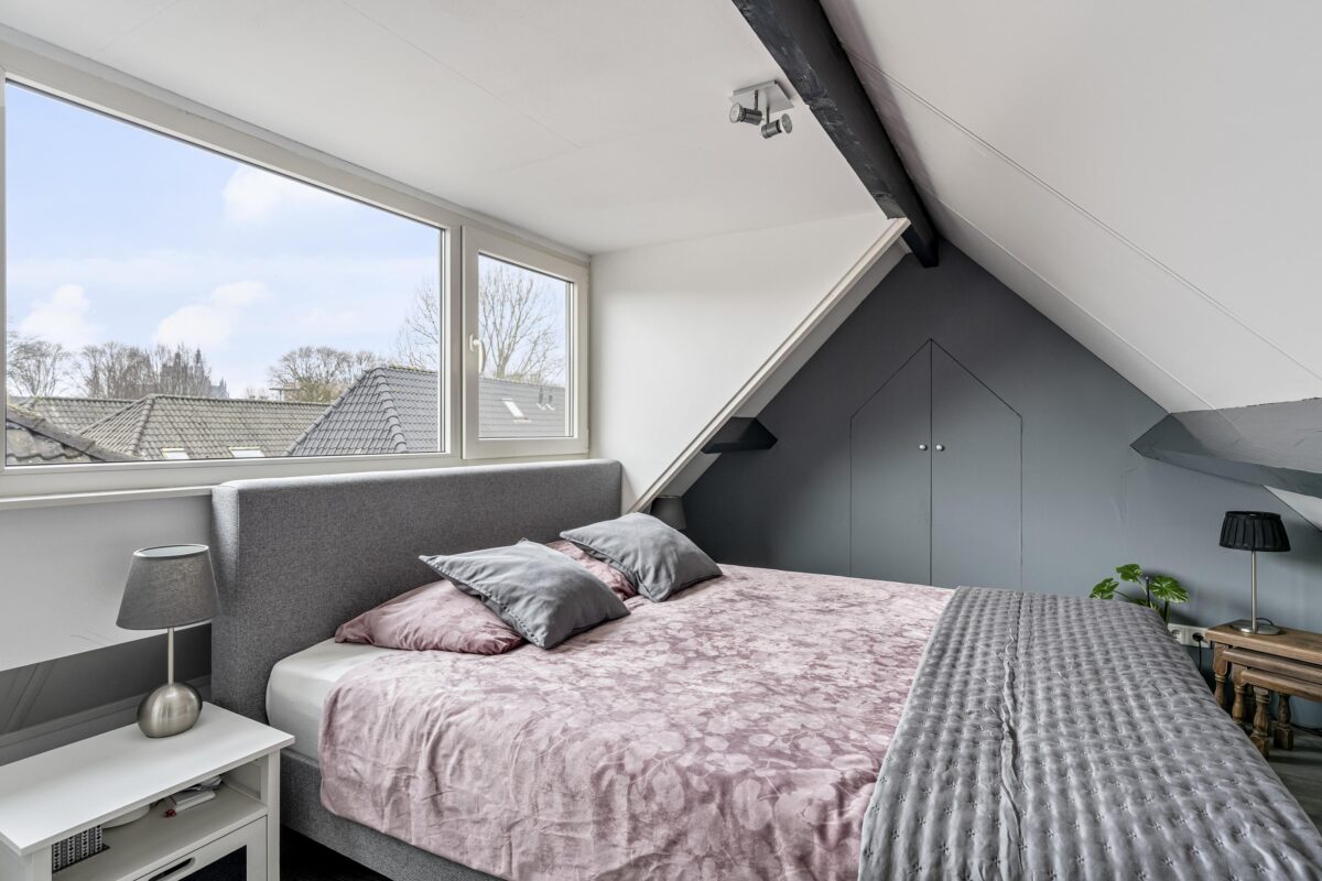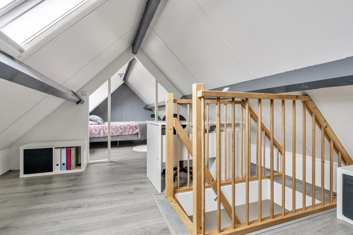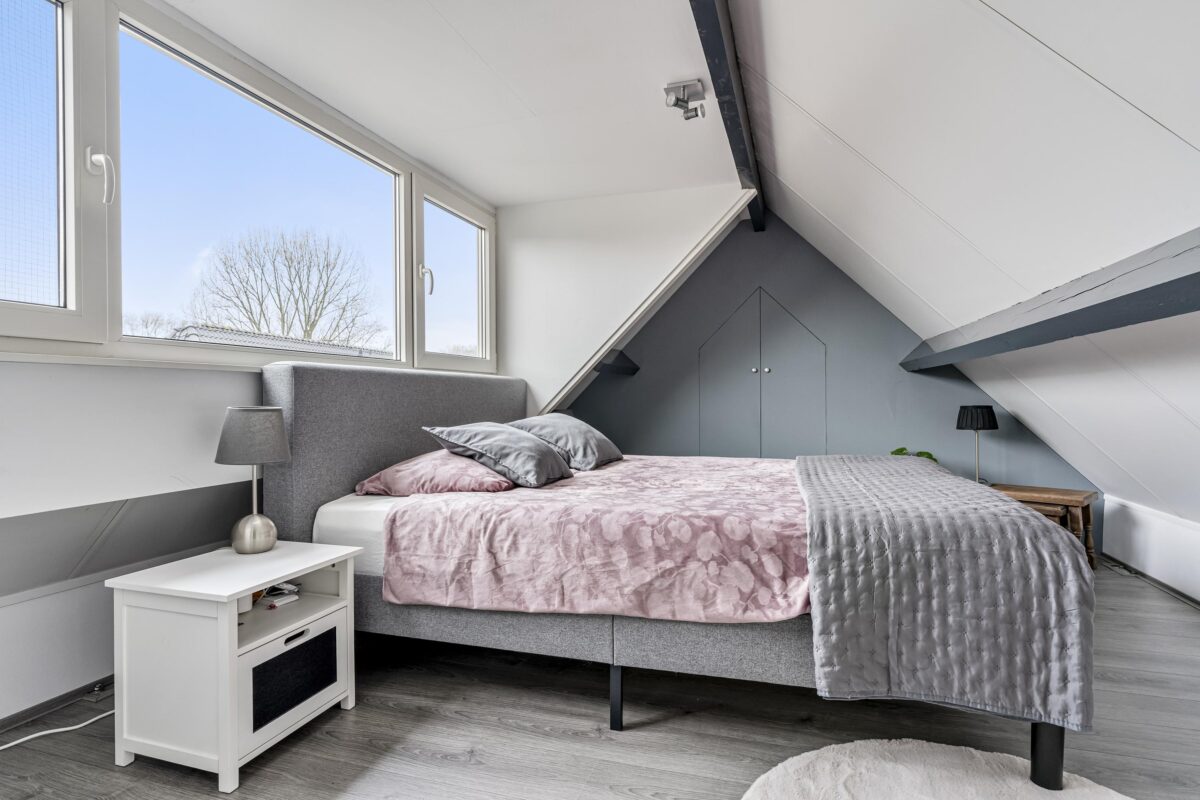 De zolderverdieping is dankzij een grote kunststof dakkapel van circa 3 meter met elektrisch rolluik en dakraam uitgegroeid tot een uitstekend bruikbare extra ruimte. In de praktijk wordt deze verdieping gebruikt als hoofdslaapkamer met een praktische studie-/werkplek en twee ruime bergkasten. Deze verdieping draagt daarmee duidelijk bij aan het wooncomfort en de totale woonbeleving.