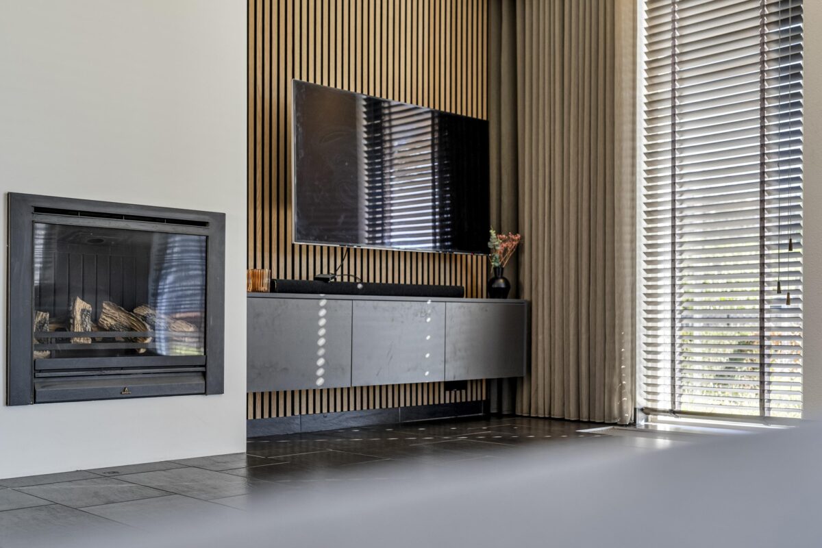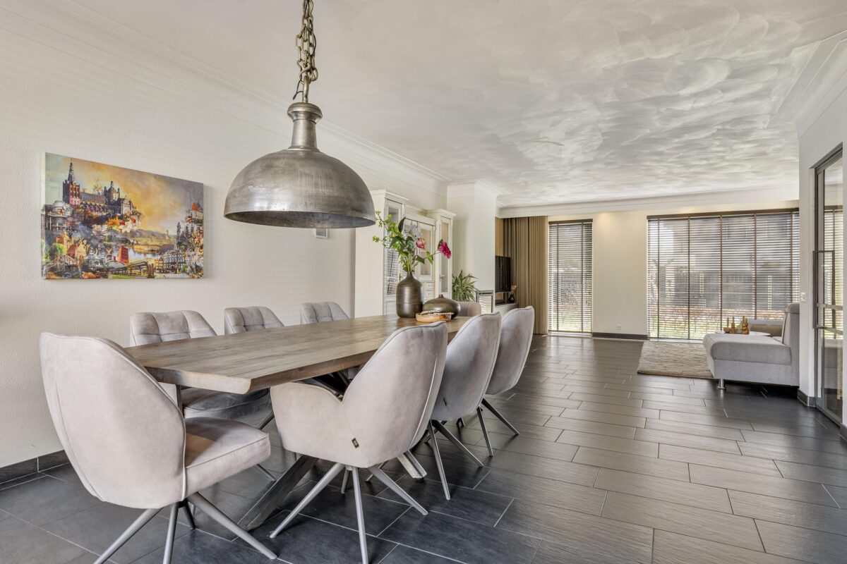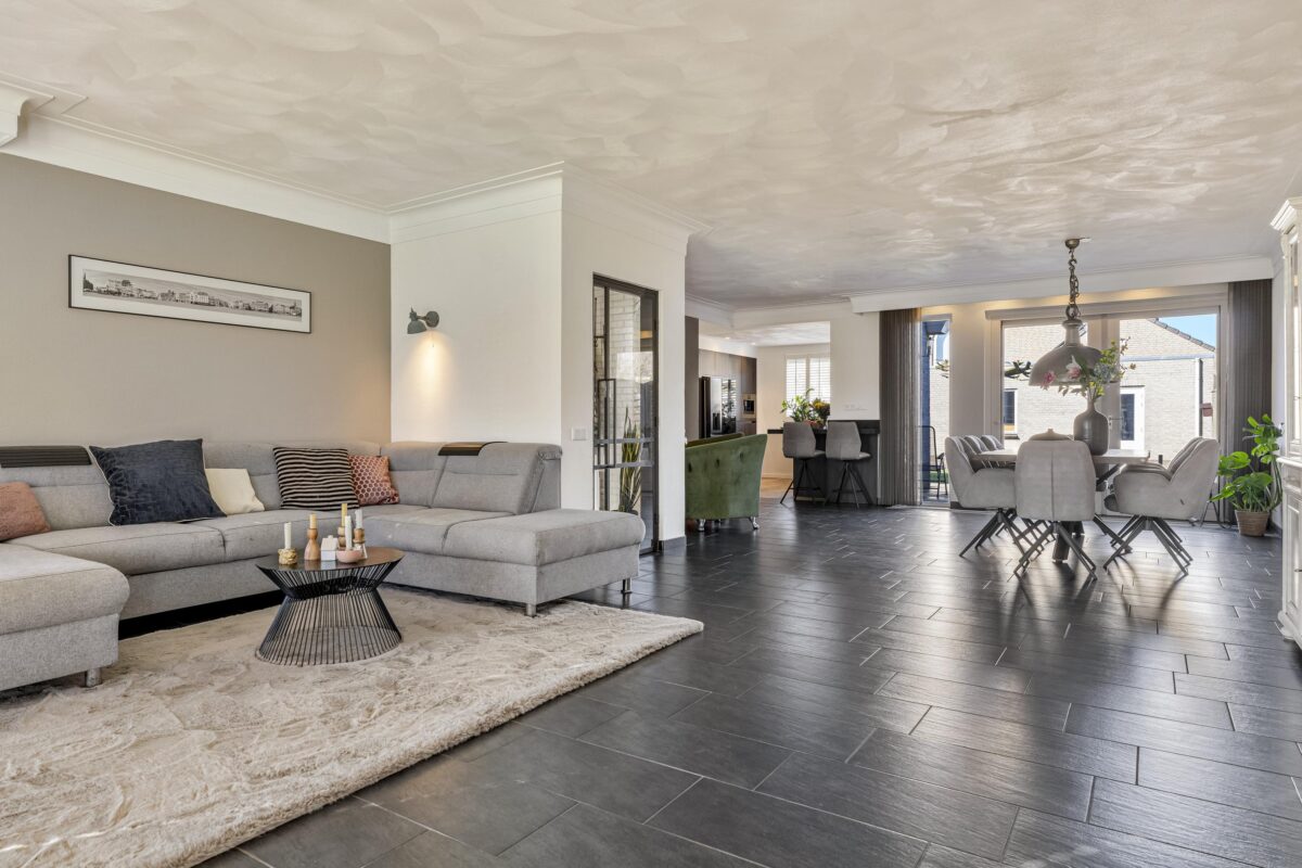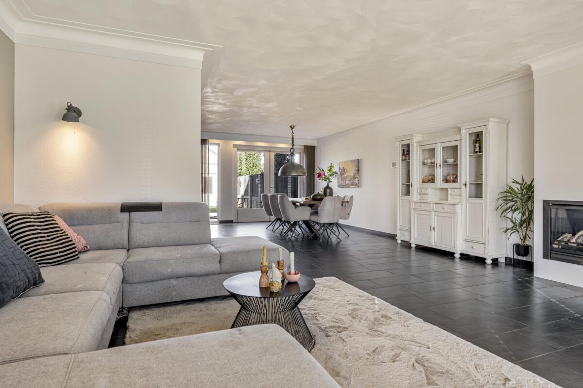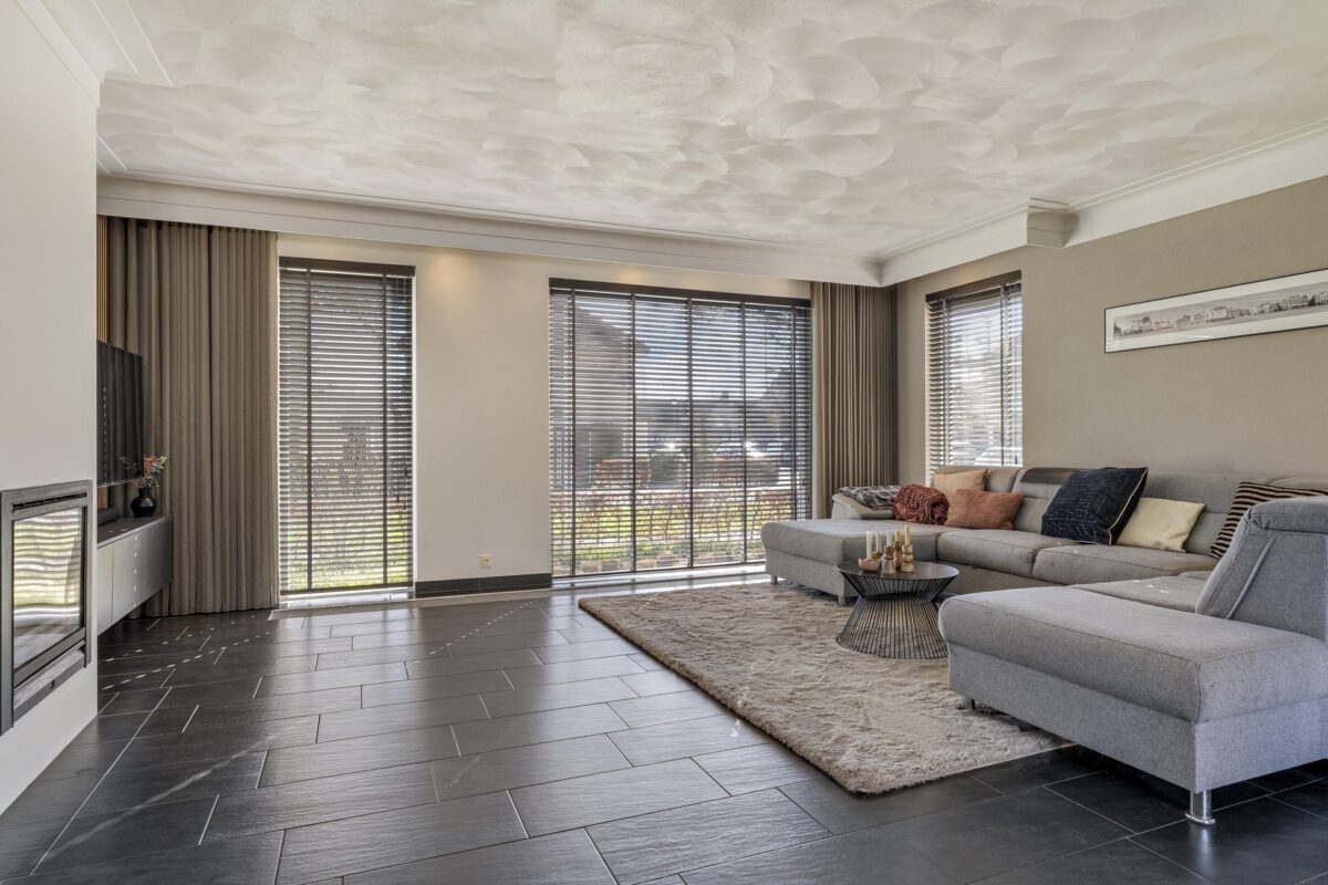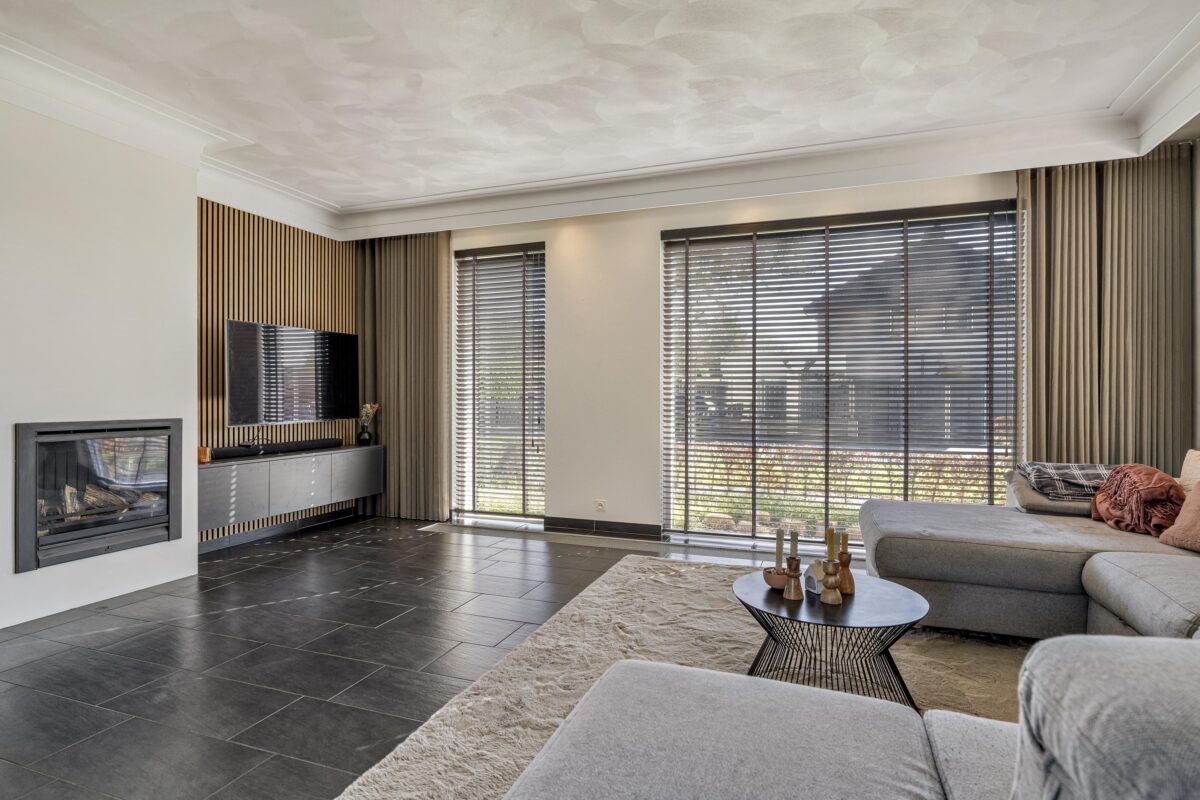 De living is werkelijk indrukwekkend. Dankzij de vloer-tot-plafondramen baadt de ruimte in natuurlijk licht. Aan de voorzijde bevindt zich de sfeervolle zithoek met fraaie schouw en gashaard. Aan de achterzijde de royale eethoek met openslaande deuren naar de tuin. Strakke wand- en plafondafwerking, sierlijsten en hoogwaardige materialen zorgen voor een stijlvolle en warme uitstraling.