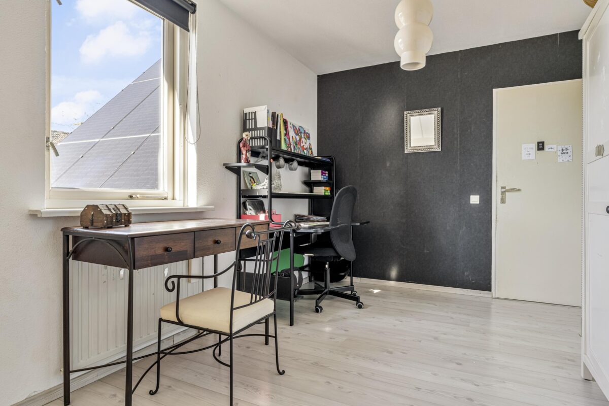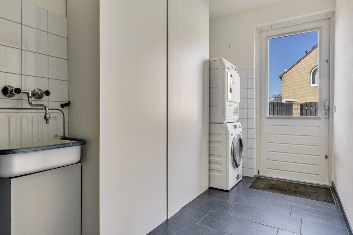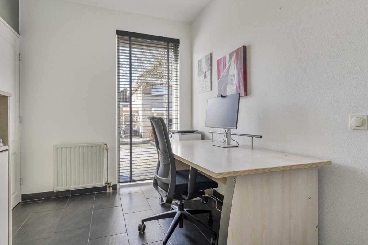 Aansluitend vind je de praktische bijkeuken met wasmachine- en drogeraansluiting, uitstortgootsteen en technische installaties. Daarnaast is er een extra kamer op de begane grond, perfect als thuiswerkplek, speelkamer of praktijkruimte.