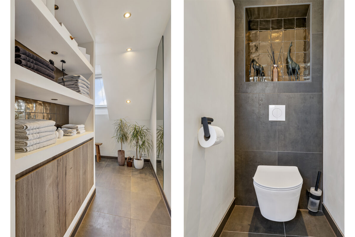 De luxe badkamer (circa 2022) is compleet uitgevoerd met dubbele wastafels met meubel, whirlpool, aparte douche met sunshower, toilet en vloerverwarming. Een plek om de dag ontspannen te beginnen of juist heerlijk af te sluiten.