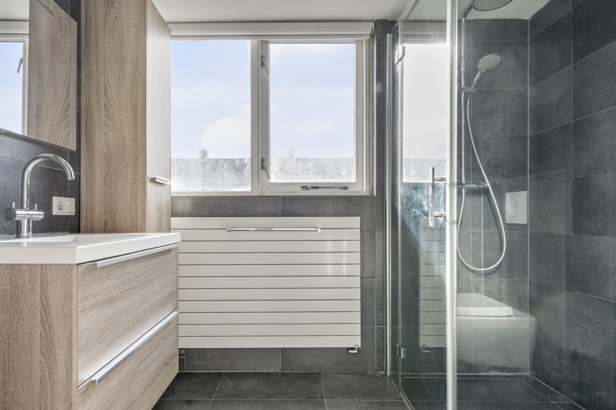 – Moderne badkamer met ruime inloopdouche, wastafelmeubel en toilet.