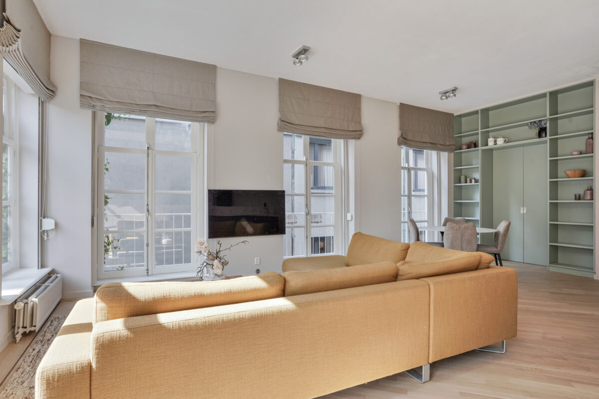 – Indrukwekkende lichte woonkamer met eiken houten vloer, grote raampartijen met interne rolluiken en een circa 3 meter hoog plafond.