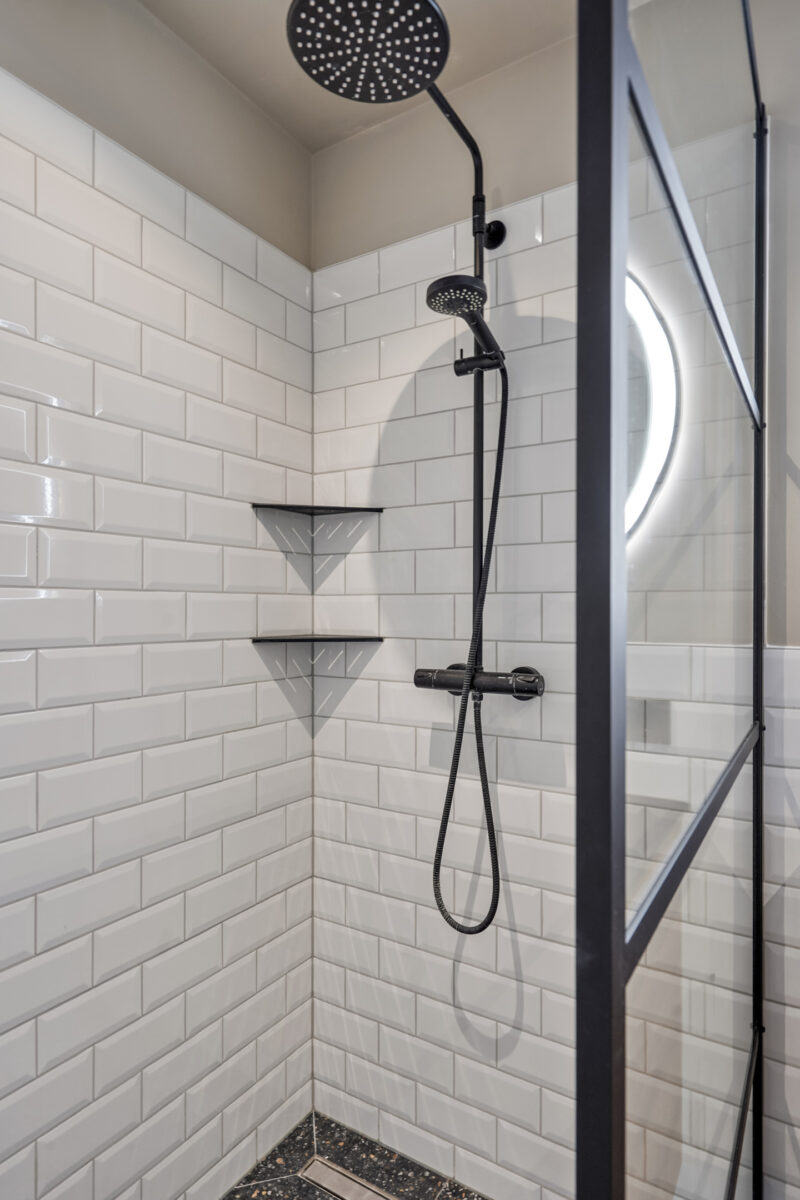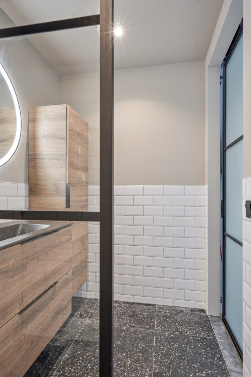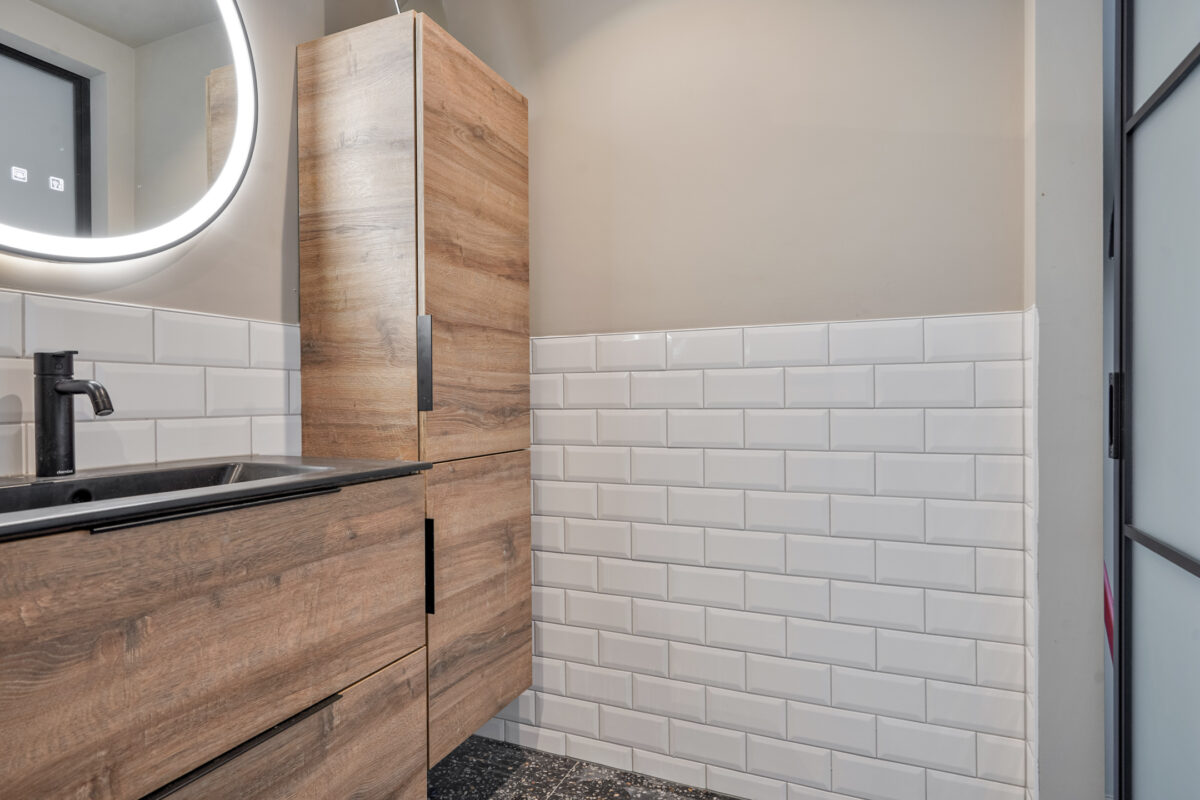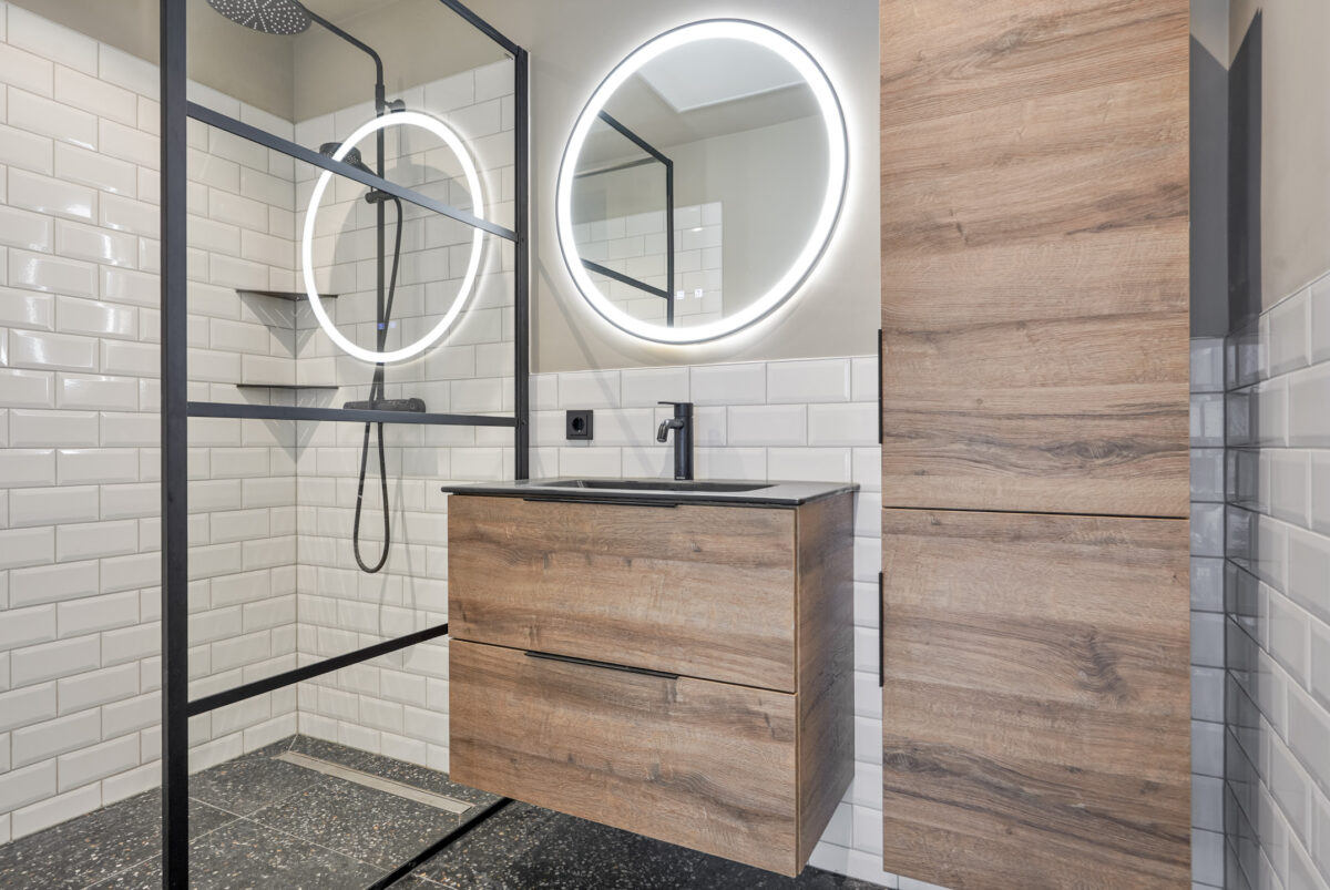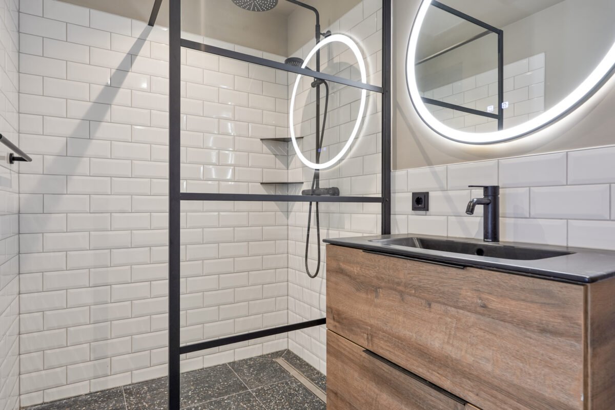 – Smaakvolle en moderne badkamer met wastafel, badkamer meubilair, en inloopdouche.