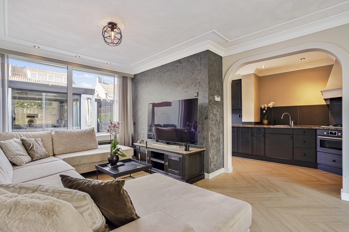 – De ruime woonkamer van circa 9 meter diep is afgewerkt met een smaakvolle PVC visgraat vloer, stucwerk wanden en sfeervolle schouw met haard.