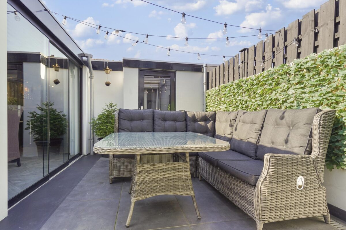 – In de achtertuin bevindt zich een grote dubbele berging waarvan een gedeelte omgebouwd is tot een ware bar. Hier bevinden zich ook de aansluitingen t.b.v. wasapparatuur.