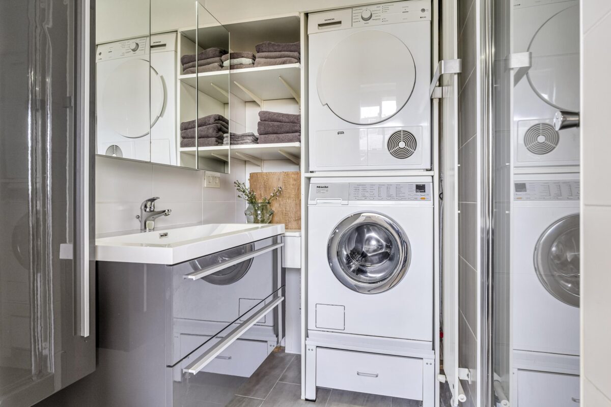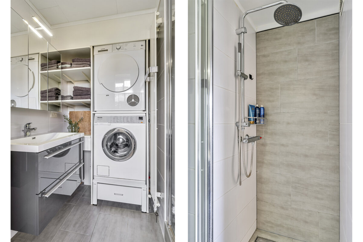 – Badkamer met douche, wastafelmeubel en aansluitingen voor wasapparatuur
