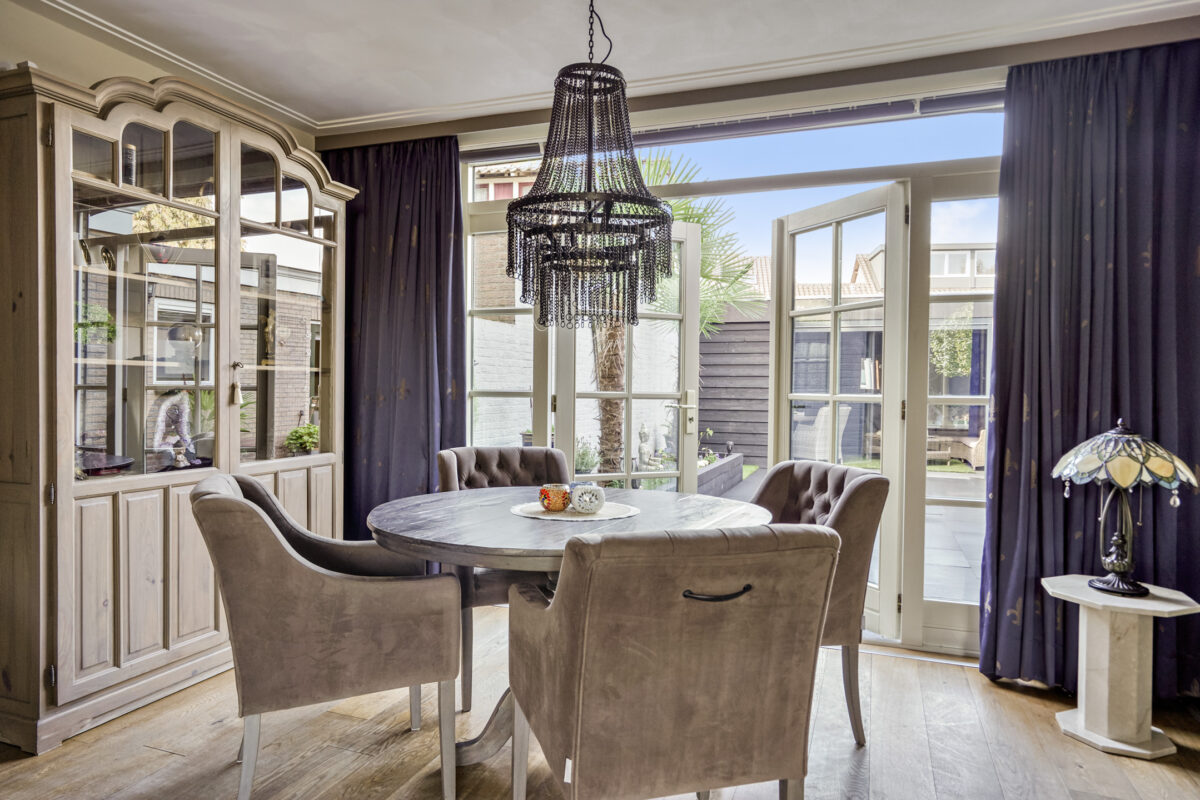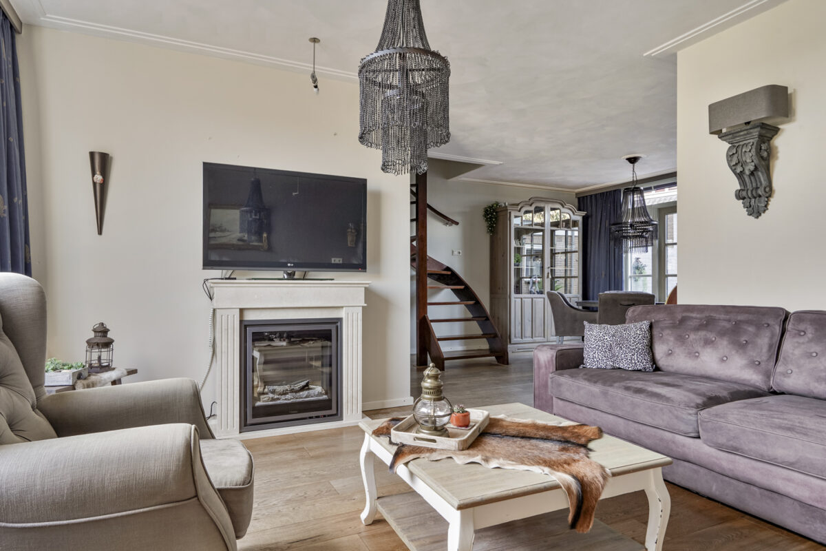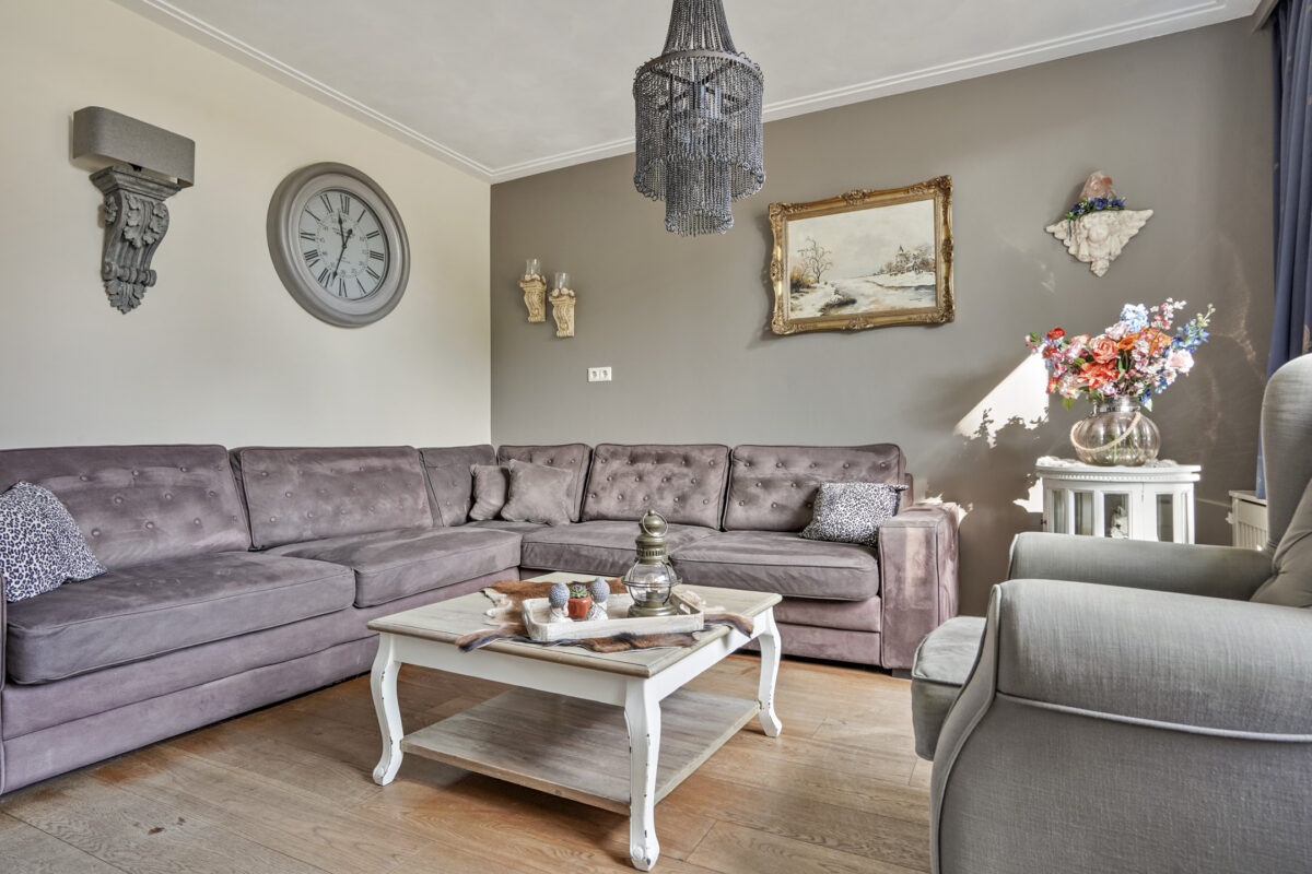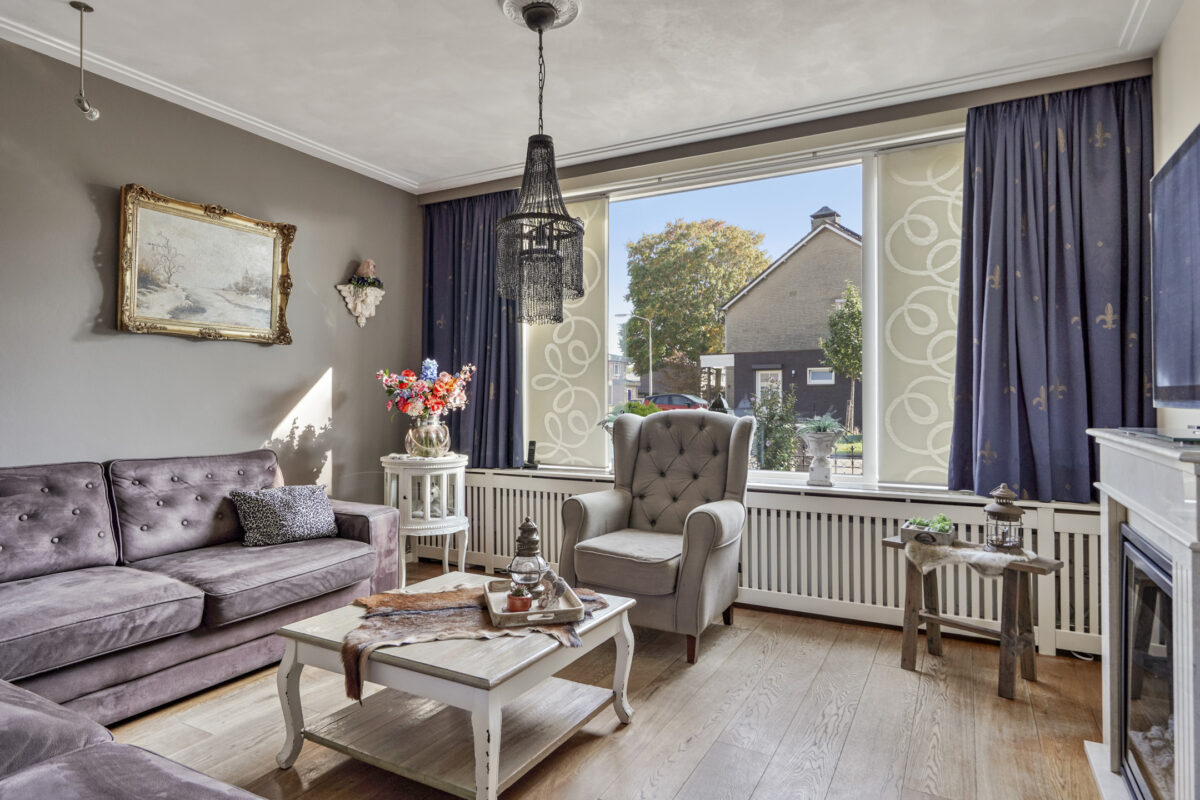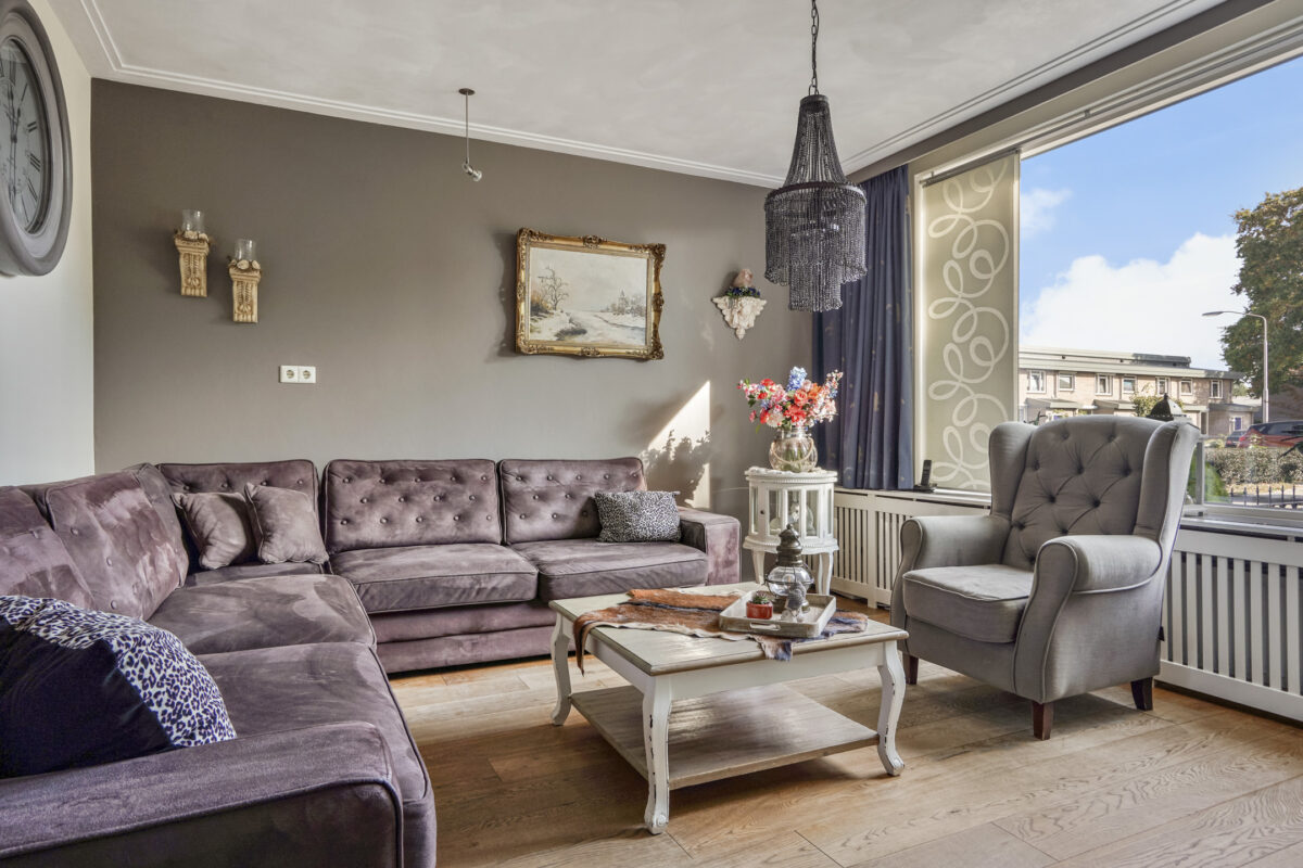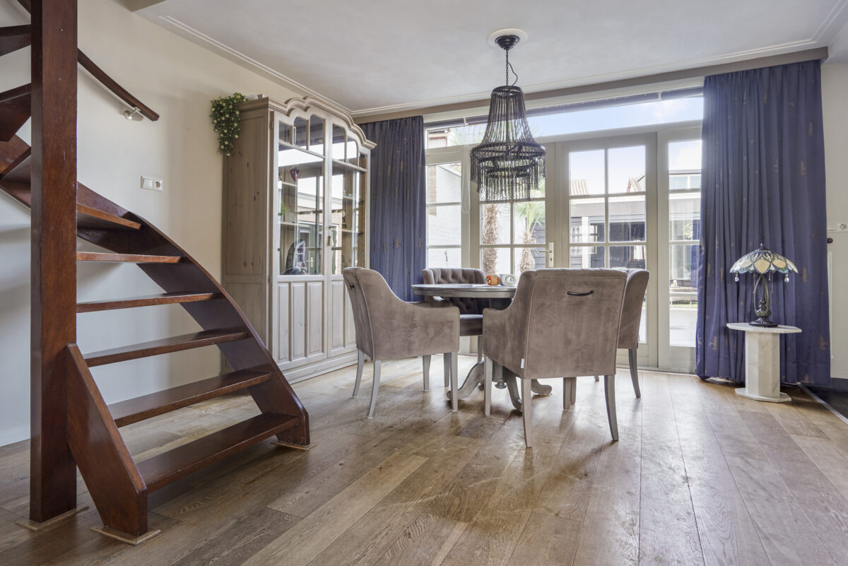 – Woonkamer met houten vloer en openslaande deuren naar de achtertuin.