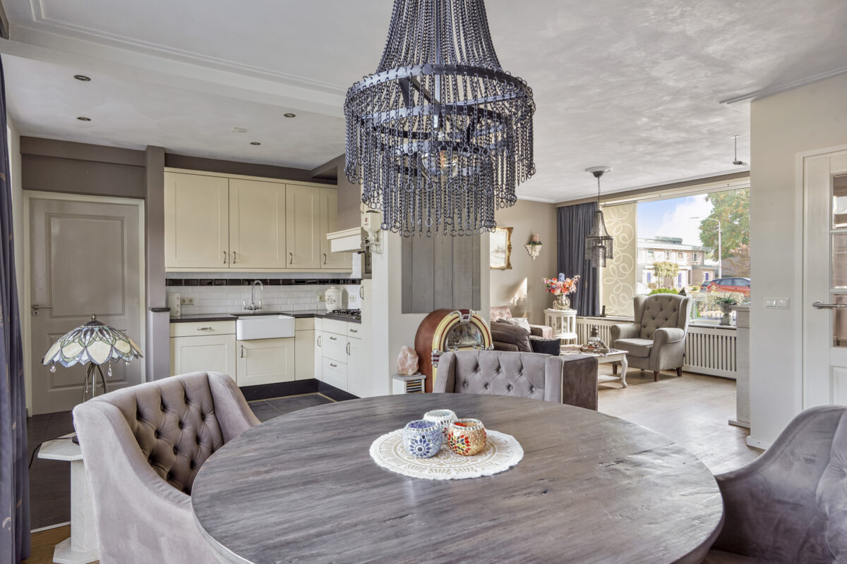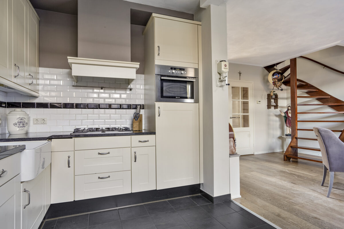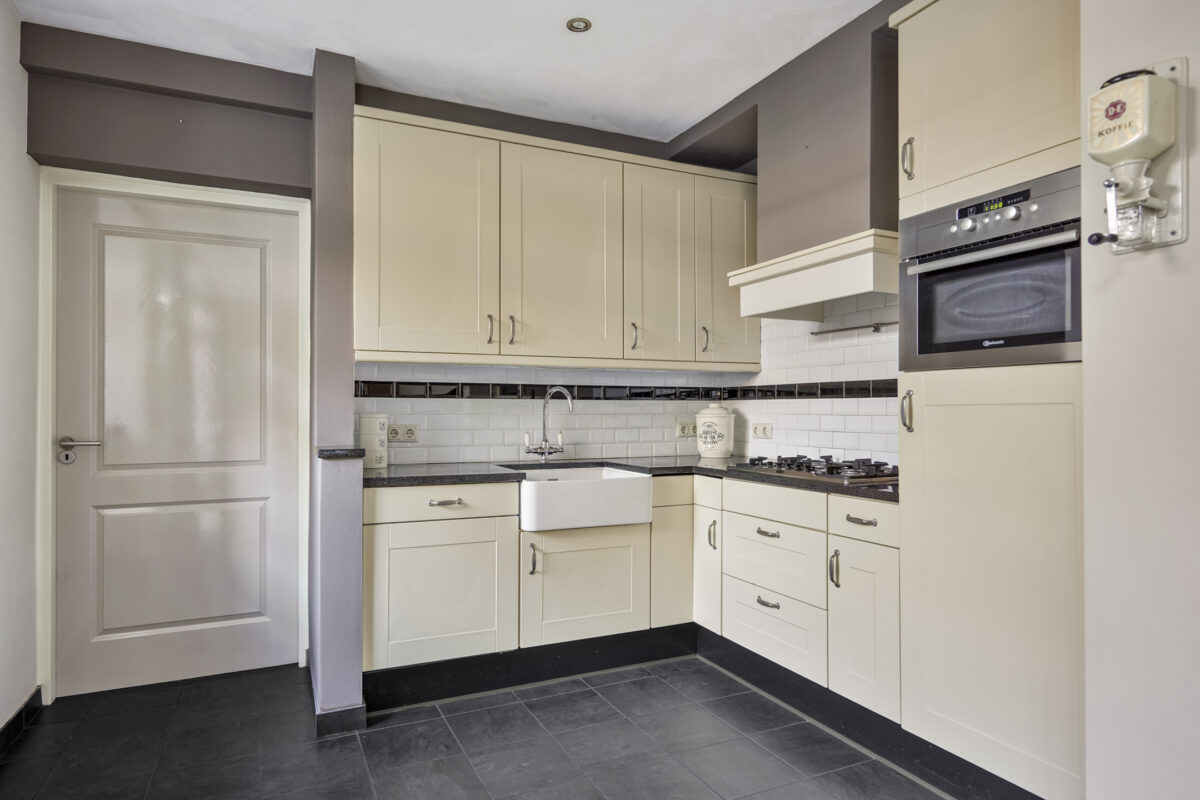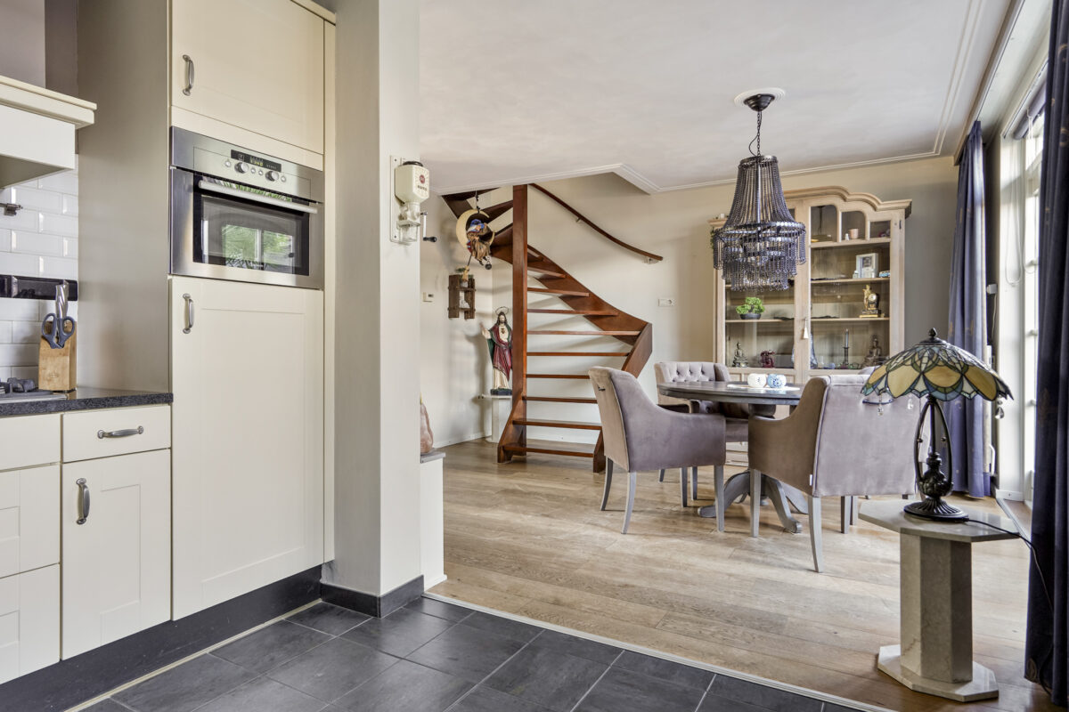 – Ruime open keuken in hoekopstelling, afgewerkt met tegelvloer en voorzien van diverse inbouwapparatuur waaronder een 5-pits gasfornuis, vaatwasser, combioven en koelkast.