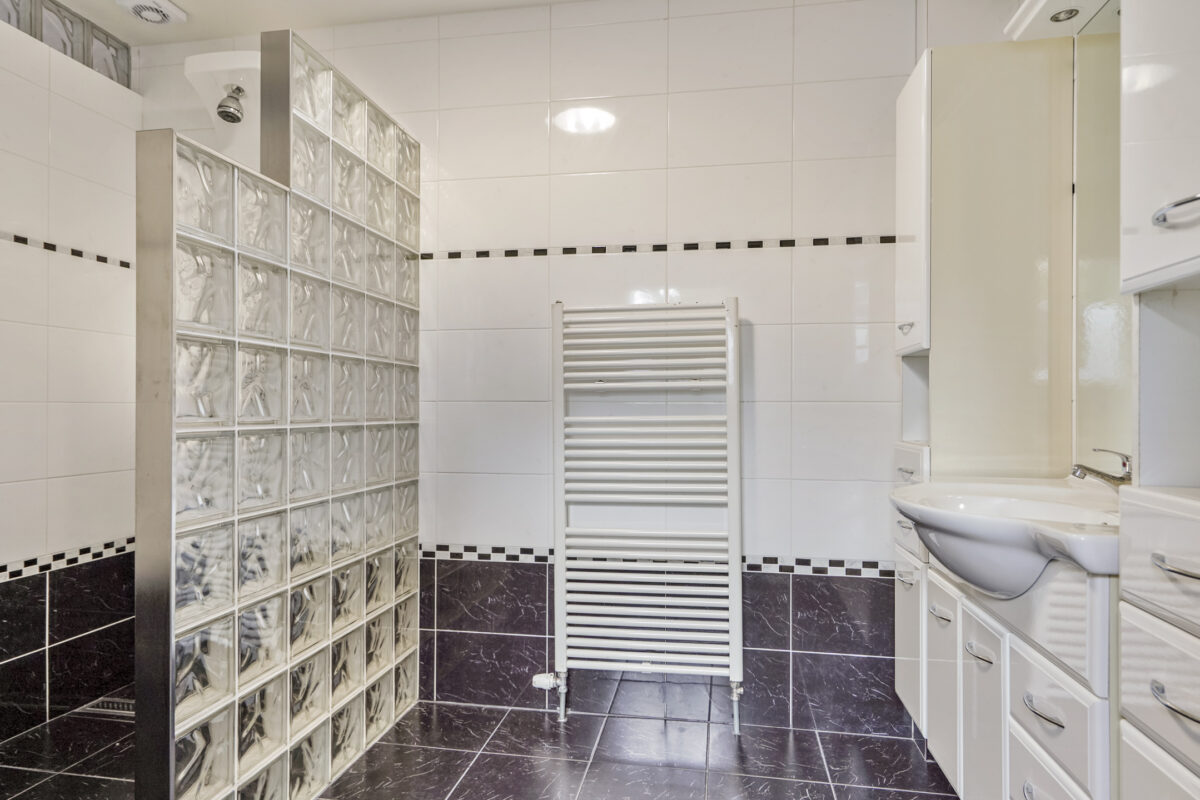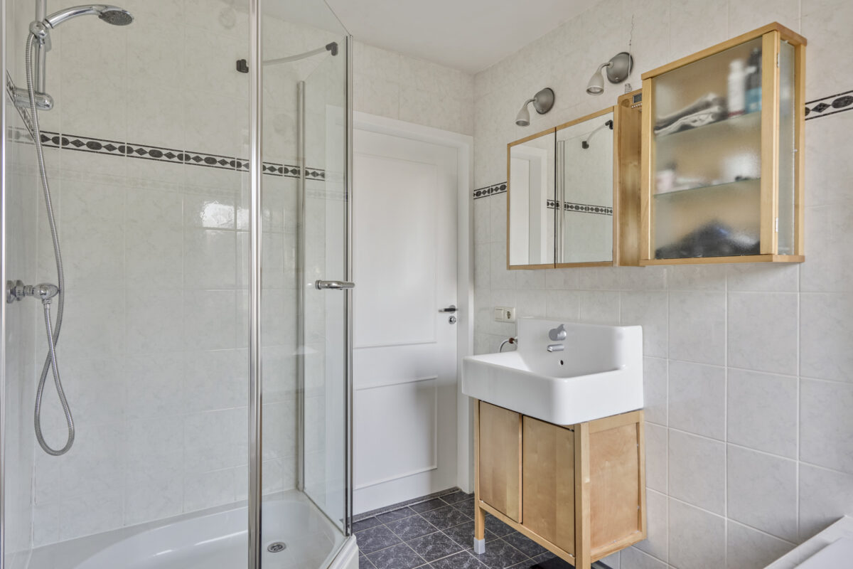 – Badkamer op begane grond met ruime inloopdouche en wastafelmeubel.